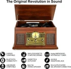 About this item [10-in-1 Mutifunctional Record Player]– With vintage mahogany wooden look & modern features, this turntable not only plays your Vinyls, but also has a CD & cassette player, FM radio, Bluetooth, and Aux & headphone jack [Bluetooth Turntable Record Player for Vinyl with Speaker]-Wireless audio music streaming from your smartphone or other external wireless device via Bluetooth or 3.5 mm Aux/headphone jack [Vinyl to MP3 Recording]-Slot-in USB/SD/MMC for encoding & decoding.Recording vinyl records directly to digital format in USB/SD card. Backup old vinyl in your PC or laptop.Note:CD is a player, it does not support recording function, but you can record CD to USB, SD card. [Three Speed Turntable with Belt drive]-This 3-speed (33 1/3, 45, 78 rpm) record player features high quality stereo sound quality with minimum vibrations. It is perfect for your living room, bedroom or office and a great choice for vinyl lovers.TIPS:When placing a 12-inch vinyl record on the turntable, gently tilt it toward the tonearm to ensure proper playback. [All The Control You Need ]– Features a volume adjustment knob, Record/delete button,Stop /USB/SD button,FM radio tuner ,Mode switch knob,CD in/out button, and easy click buttons for input select, power, play/pause/forward/rewind, eject, program, shuffle, repeat, ect Product Description FM STEREO RADIO WITH LED SCREEN INDICATOR Analogue FM function can enjoy one of your favorite commercial channels, music and story stations.Have a great relex time! Support to insert USB/SD cards. It can play your favourite MP3, WAV and WMA through stereo speakers and also can convert other audio to MP3. Package Detail 1 * User Manual 1 * Record Player DC Power cable RCA/AUX Cable BLUETOOTH RECORD PLAYER Built-in Bluetooth Receiver lets you stream your music wirelessly.Playing music from external wireless device, such as mobile phone, laptop and other Bluetooth device.You only need to turn on Bluetooth device , search for the product ,then match pairing each other. Now you can enjoy your favorite music . RECORD PLAYER WITH POWERFUL SPEAKERS The record player equips with 2 Built-in powerful speakers and you can play your tunes directly with clear sound. You can enjoy the stereoscopic,real and live vinyl audio in dual speakers. RCA LINE OUT TO CONNECT EXTERNAL SPEAKERS You can extend the sound by connecting external speakers or an amplifier via the RCA Line outputs. For personal listening, plug your headphones into the headphone jack.Design for more ventilation holes can better dissipate heat. 3-SPEED BELT DRIVEN TURNTABLE Belt-driven,3-speed turntable (33⅓1/3, 45, 78 RPM) plays all of your 7/10/12 inches vinyl records and albums with durable ruby diamond needle and stable platter CD AND CASSETTE TAPE PLAYER Easily insert your favorite CDs and cassette tape into the built-in Player and enjoy the music through the powerful stereo speakers. RECORD VINYL/CD/CASSETTE/RADIO TO MP3 Recording vinyl records/CD/CASSETTE/RADIO directly to digital format in USB/SD card. No PC or laptop required, easily digitize your favorite vinyl records to MP3.