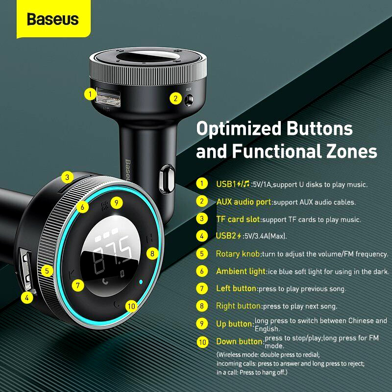 Baseus Wireless FM Transmitter Bluetooth 5.0 Car Charger Kit