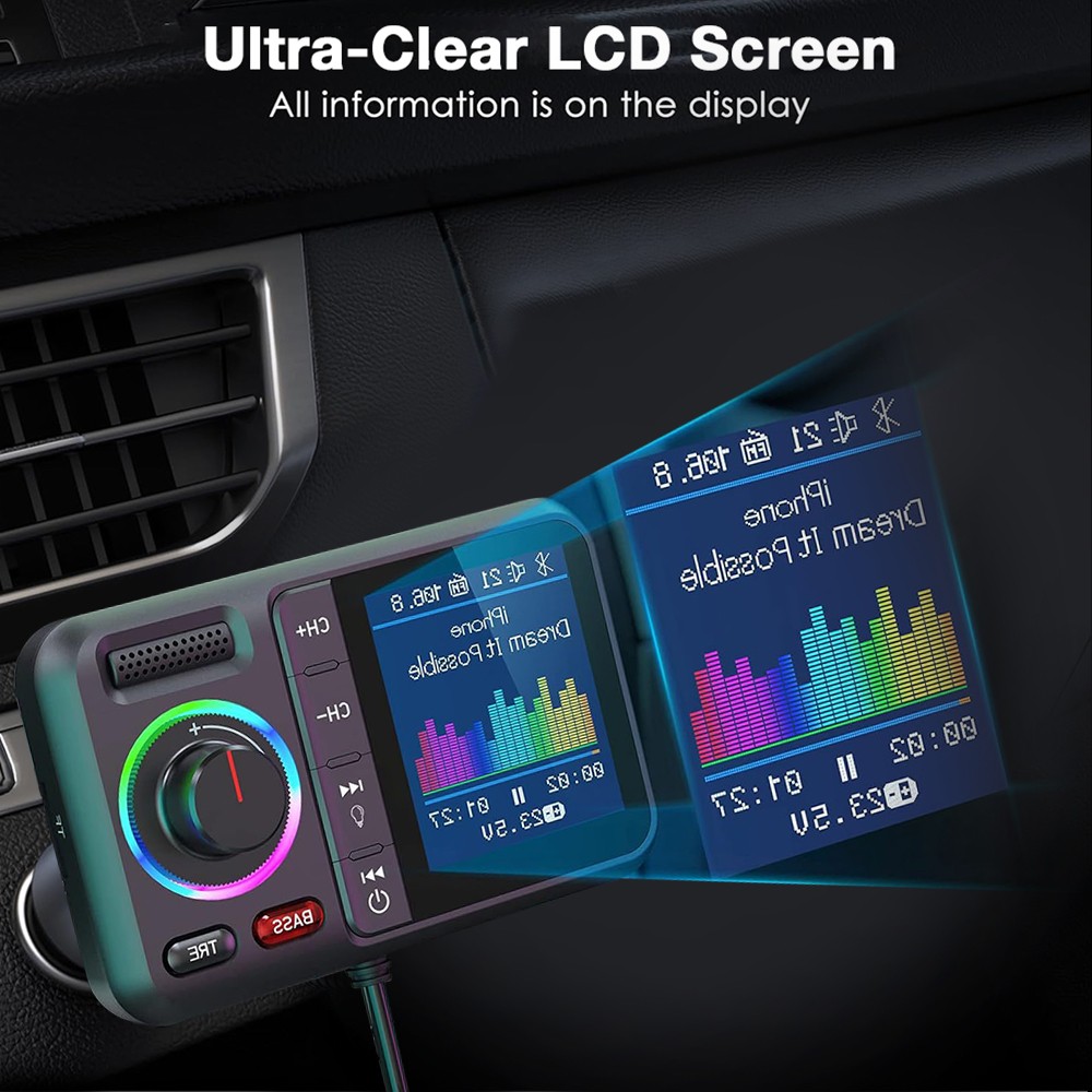 Product Description Description: Colorful LCD Screen: This Bluetooth adapter is equipped with large LCD screen, providing more information than other products. Display details include Bluetooth name, FM channels, connected device name, car voltage, music title, music count, volume, incoming phone numbers and play status. The 360° flexible design ensures a comfortable visual experience and easy access for hands-free calling. Hands-Free Calling & Bluetooth 5.0: With the latest CVC noise cancellation and Digital Signal Processor (DSP) technologies, the built-in microphone picks up your voice from all directions. The Bluetooth 5.0 chip ensures a faster and more stable connection, making it easier to stream music and make hands-free calls. It also reconnects automatically to the last paired device for convenience. Dual USB Ports & QC3.0 Fast Charging: The bluetooth FM transmitter features dual USB ports (QC3.0+2.4A), allowing you to charge two devices simultaneously with QC3.0 technology for fast charging—up to 4x faster than standard chargers. It also includes TF card and AUX ports, giving you multiple ways to play music via USB drive, TF card, AUX or Bluetooth. Note: TF card not included. Activate Siri & Hands-Free Use: Easily stay focused on the road by activating Siri or Google Assistant for hands-free calling, messaging and navigation. The large button allows you to answer, redial, hang up or reject calls with a simple press. It also supports voice notifications from navigation apps, making it even easier to stay safe and connected while driving. Enhanced Treble & Bass Control: Experience Hi-Fi sound with the FM transmitter, featuring independent treble and bass control for a personalized audio experience. Adjust the sound to your preference and enjoy audiophile-grade quality with an auto-syncing colorful music spectrum that creates the perfect party atmosphere. Specifications: Name: Car Bluetooth Player Material: ABS Color: Black Size: 82×52mm/3.22×2.04inch Bluetooth Version: 5.0 Bluetooth Distance: >7M FM Transmission Frequency: 87.5-108.0MHz FM Transmission Distance: <3M Package Includeds: 1×Bluetooth Adapter 1×3.5mm Audio Cable 1×User Manual Note: 1. Please allow 0~1 inch error due to manual measurement. Thanks for your understanding. 2. Monitors are not calibrated same, item color displayed in photos may be showing slightly different from the real object. Please take the real one as standard. Payment Shipping Returns Contact Us 1. This is the payment method we can accept: Paypal 2. You can checkout and pay immediately after the auction ends or you complete the purchases. If you need an eBay invoice sent to you by Email, please contact us before making payments. 3. Once the checkout is completed, you will not be able to include any additional purchases. We start to process and fulfill your order once payment is received. New purchases after the checkout will be processed separately. 4. Payments are expected within 4 days after the order is confirmed. Unpaid item (UPI) strike may be filed with eBay upon non-receipt of payment. 1. How much is the shipping & handling (S&H)? Our shipping and handling charges are clearly stated in the Shipping and Payments section of the item page, and we provide Free Shipping for most items. 2. For multiple purchases, the combine shipping discount will be automatically calculated when you check out and pay all of your purchases together. Items checked out separately may not be combined and the combine shipping discount will not be offered automatically. 3. Please make sure the correct Ship-To address is entered before checking out. Once the payment is completed, you may not be able to change the shipping address. We shall not be held responsible for any wrong or undeliverable addresses. 4. We usually ship within 1-2 business days of receiving cleared payment. 1. We put buyer's satisfaction at top priority. If you're not pleased with your purchases, we'll be happy to make an exchange or refund the item total price less Shipping and Handling (S&H) charges within 30 days of your purchases. 2. For any Exchange, Refund or Return, the item must be in its original condition, including the box, packaging, and all the accessories or gifts. 3. We'll provide prepaid return shipping label if the return is a result of our error. Postage reimbursement is offered only on standard mails, and it needs to be approved by our staff prior to returning. 4. Please allow up to 7 business days for returns to be processed. 5. Shipping and Handling (S&H) charges are not refundable. 1. Customer satisfaction is very important to us and our feedback rating reflects this satisfaction. If you have any question or concern, please contact us via eBay message. 2. We respond to all eBay messages as quickly as possible. Though your question will usually be answered very soon, please allow us up to one business day before you start thinking your message is neglected or the reply is avoided, because there would be time difference, non-working hours or public holidays that have prevented us from making an instant response. Payment 1. This is the payment method we can accept: Paypal 2. You can checkout and pay immediately after the auction ends or you complete the purchases. If you need an eBay invoice sent to you by Email, please contact us before making payments. 3. Once the checkout is completed, you will not be able to include any additional purchases. We start to process and fulfill your order once payment is received. New purchases after the checkout will be processed separately. 4. Payments are expected within 4 days after the order is confirmed. Unpaid item (UPI) strike may be filed with eBay upon non-receipt of payment. Shipping 1. How much is the shipping & handling (S&H)? Our shipping and handling charges are clearly stated in the Shipping and Payments section of the item page, and we provide Free Shipping for most items. 2. For multiple purchases, the combine shipping discou