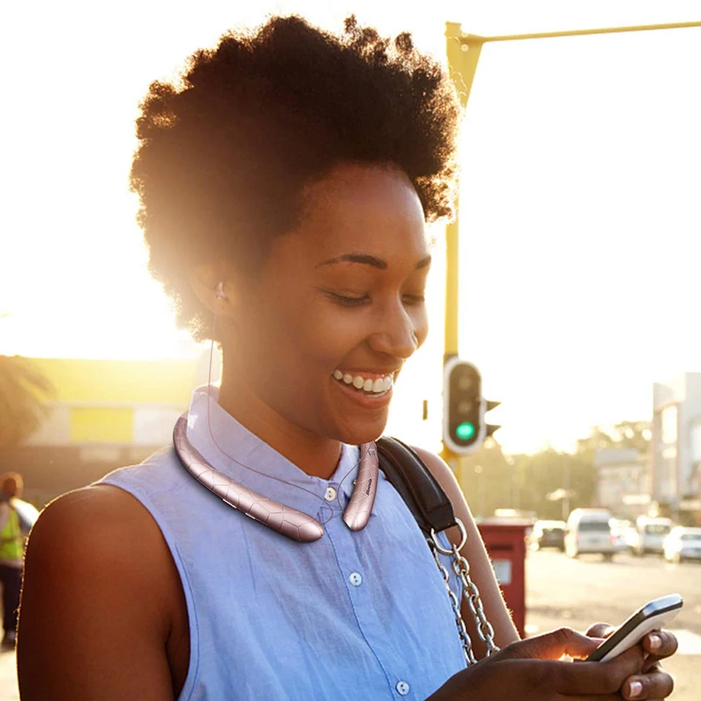 Neckband Headset Waterproof Workout Headphones Bluetooth-Compatible5.0 Noise Canceling Retractable Earbuds with Mic for iPhone Samsung LG Feature: 1.Unique Design for a Stylish Look: T hese neckband headset feature a distinct texture design that enhances your fashion statement. The lightweight design, ergonomically curved flexible memory neckband ensures long-term wearing comfort and safety. 2. Bluetooth-Compatible 5. 0 Technology: With Bluetooth-Compatible 5.0, these wireless earphone offer low power consumption, faster transmission speeds, zero latency for calls, strong anti-interference capability, and a more stable signal. Immerse yourself in a lifelike audio experience with powerful bass, rich and detailed middle-tones, and pure, bright trebles. These sports headphones are compatible with most Bluetooth-Compatible devices, including for iPhone, Android, Samsung, Huawei, and more. 3. Waterproof Earbuds: S tereo earphones designed to withstand everyday splashes, sweat, and rainwater, these earbuds are perfect for fitness activities and travel. 4. Intelligent Noise Cancelling Technology: Equipped with dual microphones for noise reduction and echo cancellation, these running headset minimize external distractions during calls, providing you with clear, immersive stereo sound. 5. Convenient and User-Friendly Features: The charging indicator shows a red light while charging and turns blue when fully charged. The workout headphones have two small buttons on the inner sides for adjusting and retracting, ensuring a secure fit. They are sweatproof and come with a neckband for added convenience. Specification: Origin: Mainland China Style: Neckband Communication: Wireless Wireless Type: Bluetooth-Compatible Vocalism Principle: Dynamic Control Button: Yes Volume Control: Yes Frequency Response Range: @@Hz Category: Earphones & Headphones Material: ABS Model: HX-831 Colour: black, rose gold (optional) Function: Battery display, multi-point connection Bluetooth-Compatible protocol: 5.0 Battery: 150mAH Sound Channel: Stereo Usage: Earbud Package size: 195*185*30mm/7.68x7.28x1.18inch Gross weight: 150g Note: Due to the different monitor and light effect, the actual color of the item might be slightly different from the color showed on the pictures. Thank you! Please allow 1-2cm measuring deviation due to manual measurement. 1 X Headset 1 X Charging Cable 2 Pairs X Earplugs 1 X Instruction Manual