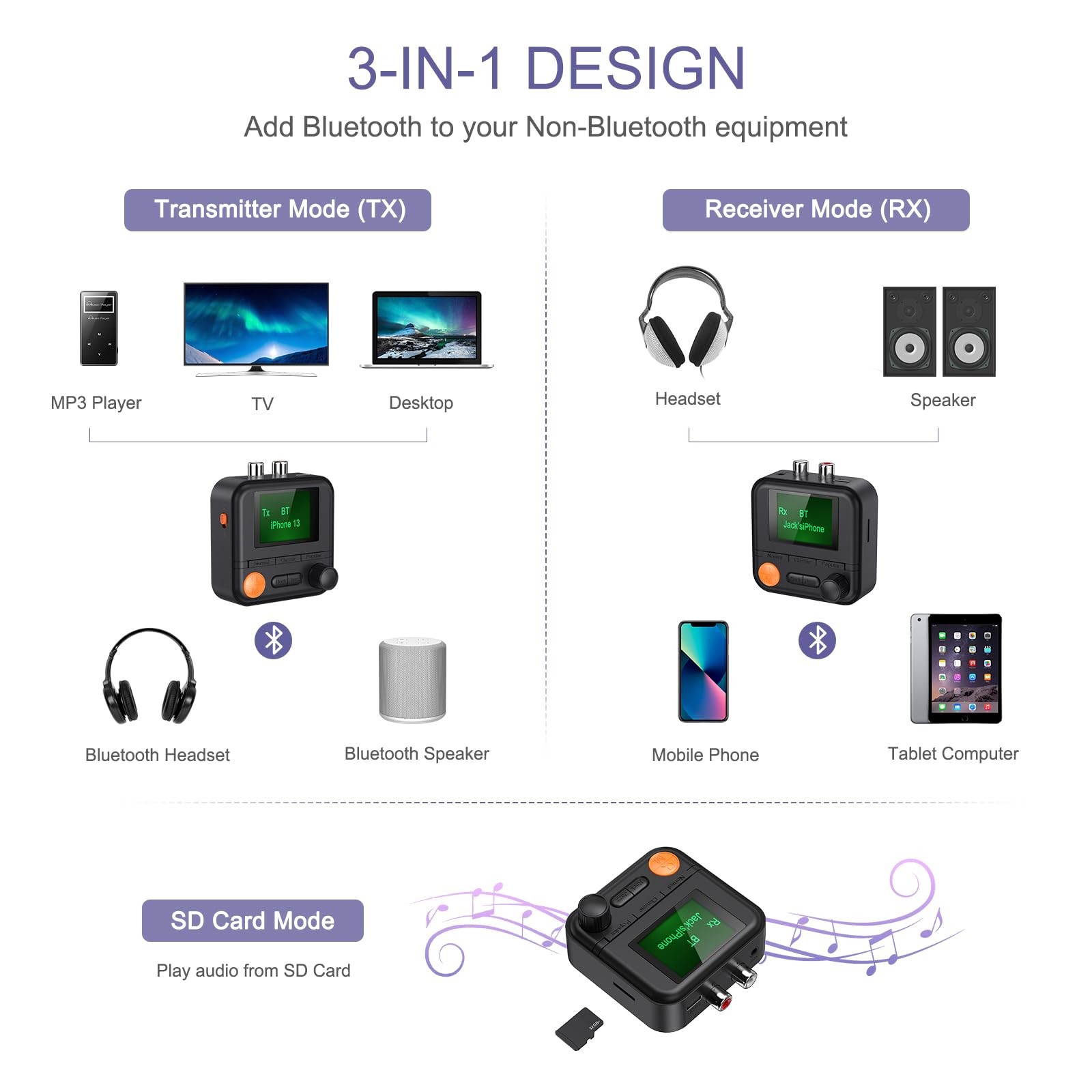 2-in-1 Bluetooth transmitter receiver Features: Bluetooth Version: V5.2 Working Range: 33ft Clear display screen: It can display the name of the searched Bluetooth devices, can help you better pairing. Support: RCA, 3.5mmAUX Audio Output, TF card play(Max 32GB). Plug and Play: No any driver requires. It is easy to pair, Wide Compatibility: Support audio music streaming sound system, TV, home stereo, Car stereo, speakers, headphones, earbuds, etc. Package Includes: 1*Bluetooth Adapter 1*AUX Auxiliary Output Cable 1*RCA Connection Cable 1*Data Cable 1*English Manual Bluetooth 5.2 Audio Aapter: Bluetooth adapter can add Bluetooth function to your non-Bluetooth device,( like vintage stereo, speakers, TV, desktop computers, or car stereo), allowing you to enjoy wireless audio more convenient. With new upgrade Bluetooth V5.2 version, Bluetooth signal is stronger, and it can receive Bluetooth signal within 33ft, the transmission is more stable. You can enjoy CD-like sound quality. 2 in 1 Bluetooth Transmitter Receiver: aux bluetooth adpater integrates two functions in one: Bluetooth transmitting and Bluetooth receiving. You can play music through Bluetooth connection, but also can parse the audio in the SD card for playback. You can freely choose music EQ according to their preferences, can choose ordinary/rock/pop/classic/jazz 5 music styles; Easy to Operate: When power on the device, just connect with other devices through AUX cable or RCA cable, then you can use it and enjoy music. It can be connected to Bluetooth devices and SD cards at the same time, a key to switch between different modes. Large Screen Display: Bluetooth adapter is designed with a 1.44inch display, which can display the name of the searched Bluetooth devices to help users better pairing; In TF card mode, you can also read the name of the music through the display. Multiple Interface: This Bluetooth adapter only supports RCA and AUX transmission, but also can be inserted into the FT card, so you can enjoy the music atmosphere anytime and anywhere. It is suitable for Home Stereo, TV, Car stereo, PC, Headphone, Speaker, audio system.