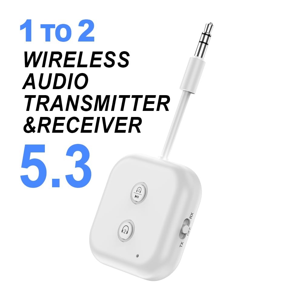 [2-IN-1 Bluetooth Transmitter & Teceiver] Easy to switch between transmitter (TX) and receiver (RX) modes; In TX mode, the aux Bluetooth transmitter connects non-Bluetooth audio sources such as airplanes, PC, TV, or MP3 players to Bluetooth earbuds, earphones, headphones via 3.5 mm (AUX) cable; In RX mode, plug the Bluetooth receiver into wired earbuds/headphone/earphone and receive audio from cell phone/tablet/computer via a 3.5mm AUX cable. [2-IN-1 Bluetooth Transmitter & Teceiver] Easy to switch between transmitter (TX) and receiver (RX) modes; In TX mode, the aux Bluetooth transmitter connects non-Bluetooth audio sources such as airplanes, PC, TV, or MP3 players to Bluetooth earbuds, earphones, headphones via 3.5 mm (AUX) cable; In RX mode, plug the Bluetooth receiver into wired earbuds/headphone/earphone and receive audio from cell phone/tablet/computer via a 3.5mm AUX cable. [Stable Connection] The 2 in 1 wireless Bluetooth adapter is equipped with Bluetooth V5.3 chip to achieve stable connections, wide signal range, and fast transmission; It could be connected with Bluetooth headphones that support A2DP/AVRCP/HFP protocol to form wireless audio transmission network when watching movies or TV programs; Additionally, the Bluetooth 5.3 adapter has a 10m/33ft reach so you can relax with plenty of space to enjoy your content. [Dual Pairing To Share Fun] In TX mode, the Bluetooth 5.3 transmitter receiver can simultaneously connect two Bluetooth headphones/earbuds/earphones; It could fulfill your thoughts of listening to music or watching movies together with your partner without bothering others. [Support Hands-Free Calls] The wireless Bluetooth adapter provides upgraded car audio to Bluetooth audio hands-free calls when driving, that when under RX mode, you may press the button 1 to answer and hang up the phone, or long press the button 1 to reject the phone call. [Large Capacity] With the Bluetooth 5.3 technology, it would reduce power consumption and offer fast and stable transmission; The playtime of the 2 in 1 wireless 3.5mm Bluetooth adapter would be up to 13 hours when one pairing two, or up to 14.5 hours when one pairing one after fully charged. When under low battery situation, the button 2 light of the wireless 3.5mm bluetooth transmitter would keep flashing red light, and when charging, button 2 would keep stable red light; After the Aux Bluetooth adapter has been fully charged, the button 2 red light would be off. [Wide Compatibility] The Bluetooth audio transmitter and receiver works with 3.5mm audio devices including in-flight entertainment systems, computers, treadmills and other gym equipment, gaming devices, TVs, and portable DVD players, allowing item such as wired speakers/soundbars, rental cars, and boat sound systems to wirelessly receive audio from gaming devices, phones or tablets.