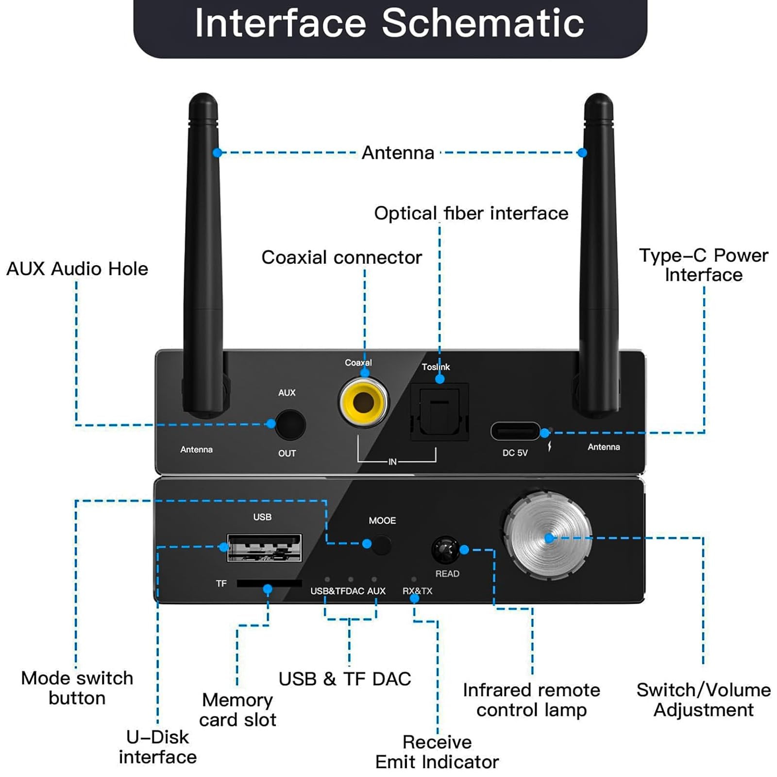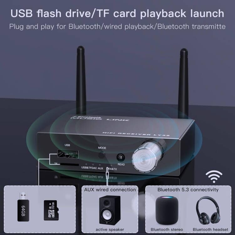 Bluetooth Transmitter for TV Audio Bluetooth Adapter for Stereo Receiver Bluetooth Transmitter Receiver 【Wireless solution for your wired home stereo system】This Bluetooth audio adapter feature the latest 5.3 Bluetooth Technology, witch can help your old stereo system to be workable and bluetooth-enable, so you can stream music and control playlists directly from smartphones, iPhones, iPads, and more. 【2-in-1 Bluetooth Transmitter Receiver】 In TX mode, Transmits non-Bluetooth audio sources like TV or MP3 player to Bluetooth speaker and headphones via USB TF /Optical Coaxial cable. Transform a traditional or non-Bluetooth TV into a device that supports headphones, improving your listening experience and providing a private, uninterrupted environment. In RX mode, Receives audio from Bluetooth devices and transmits it to non-Bluetooth speakers, stereos, or headphones via 3.5mm AUX/RCA cable. 【Multifunctional Digital to Analog Audio Converter】It supports to convert Optical, Coaxial, Digital Audio Signals Input, Output to 3.5mm Jack Audio that are Connected to the Amplifier, Speaker, Headphone.Built-in high-performance DAC chip. 【Bluetooth 5.3 Receiver with Antenna 】The latest Bluetooth version 5.3 lossless transmission technology and Bluetooth dedicated antenna for stable signal transmission. This Comes with An IR Remote Control Can Transmit up to 100FT.(Note: Please Point The Temote Control at The Infrared Indicator Light on The Converter) 【New Button and Knob Ddesign】Professional volume control knob, turn it to control the device on and off, continue to turn the volume up and down. At the same time "MODE" button through the short press, long press, double-click, triple-click, etc., can also be mode switching and playback pause and other functions. Powered by Type-C: The bluetooth receiver for home stereo uses a Type-C port for power and requires power supply for continuous music streaming. It has no built-in battery, so ensure it is connected to the power supply before use. (Adapter not included). You Will Get -1 * Bluetooth transmitter receiver adapter, 1*3.5mm to L/R audio cable, 1* optical cable, 1* coaxial cable, 1*3.5mm audio cable, 1*USB power cable, 1* remote control, 1* manual. Tip: This Bluetooth receiver has no battery, please connect the power before use.