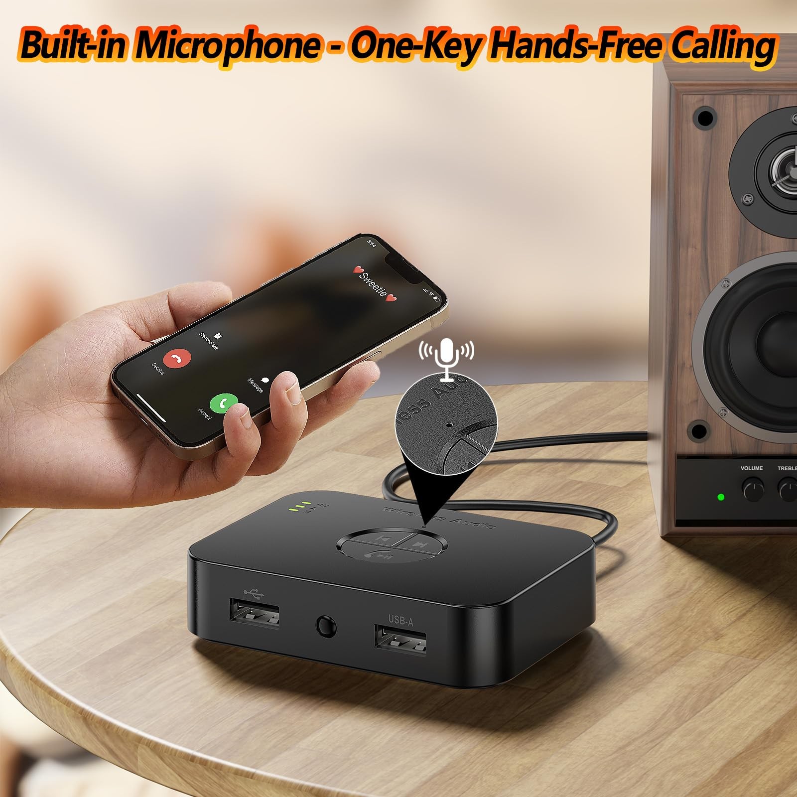 Bluetooth 5.4 Receiver for Home Stereo, Bluetooth Audio Adapter for HiFi Music Streaming, Wired Speakers, USB Flash, with AUX 3.5mm/RCA, Dual Link, 32 ftLong Range, Low Latency and HD Audio Seamless Dual-Device Audio Streaming: Revive your wired speakers with Bluetooth 5.4! Simply connect via 3.5mm AUX/RCA cables to PC speakers, home stereos, or receivers, then pair two smartphones/tablets simultaneously. Enjoy zero-latency, lossless CD-quality audio – perfect for parties or multi-room setups. (Note: Not compatible with Bluetooth headphones.) Extended 32ft Stable Range: Experience uninterrupted CD-quality audio transmission within 32 feet (10m) through Bluetooth 5.4 technology – zero latency and lossless sound even through walls. Ideal for large living rooms, patios, and multi-room setups. Instant Setup & Auto-Reconnect: Plug, Pair, Play – zero configuration needed. The Bluetooth 5.4 memory chip automatically reconnects to your last paired device within 3 seconds. Truly plug-and-play for daily use, workouts, or home entertainment. 32ft Infrared Remote Control: Includes a dedicated 10m-range IR remote for seamless track skipping/volume adjustment from your couch. Effortlessly navigate playlists without touching your phone – perfect for parties, workouts, or relaxing baths Universal Bluetooth 5.4 Compatibility: Works with any Bluetooth-enabled device: smartphones (iOS/Android), tablets, laptops, Windows/Mac computers, powered PC speakers, home stereos, and A/V receivers. No driver needed – instantly pairs with 99% of audio sources. Low Latency and Studio-Quality Audio: Advanced Bluetooth 5.4 chip dynamically optimizes bitrate for crystal-clear lossless sound and low-latency – perfect for movie dialogues and live concert streams without audio lag. NOTE: This adapter doesn't have built-in battery, power by AC to DC power adapter or USB cable. This product is a bluetooth receiver ONLY, not a bluetooth transmitter, does NOT support transmitter mode or headphone pairing. Only to give Bluetooth capabilities to an existing stereo / powered speaker / PA.
