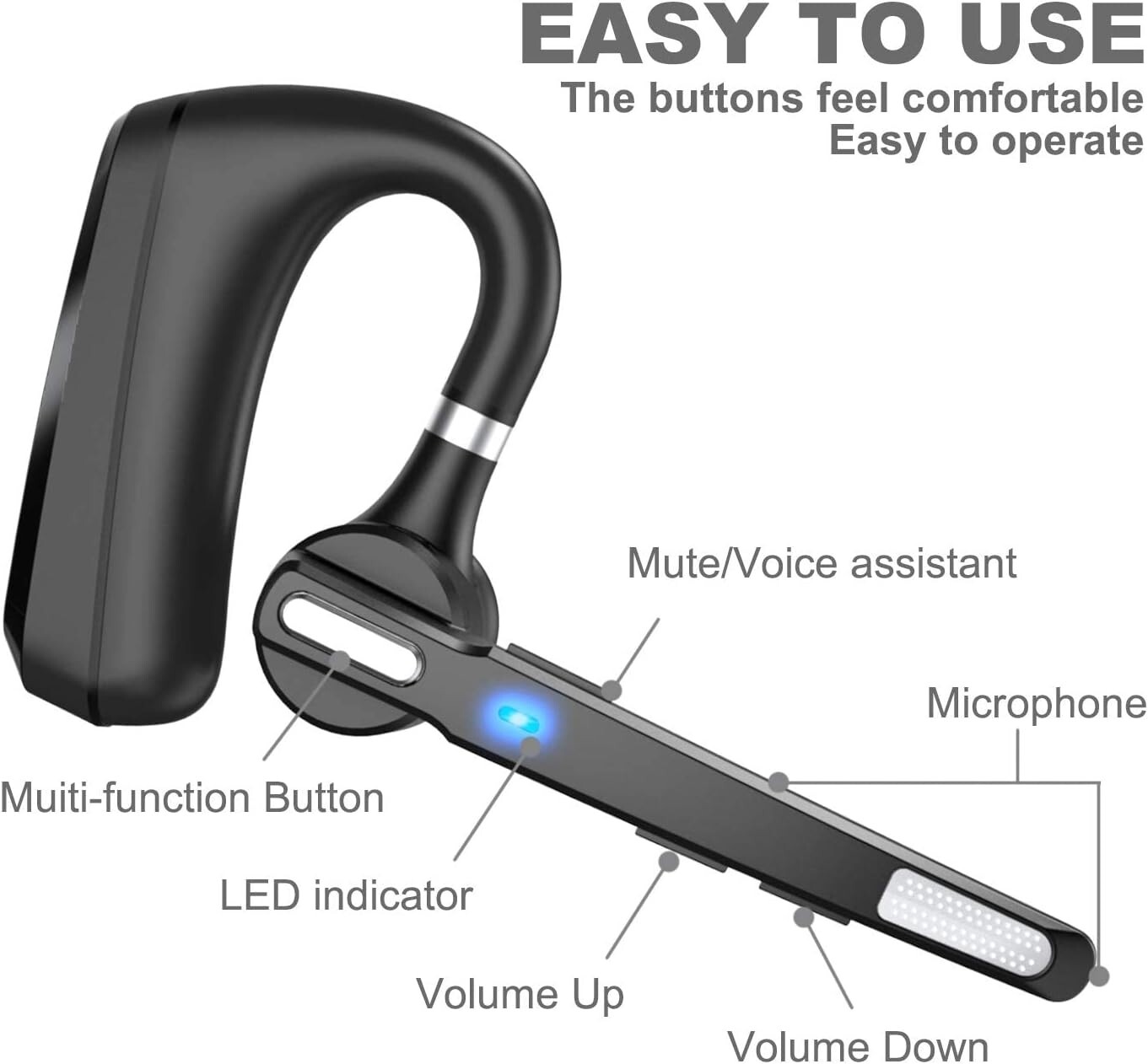 Brand MQQC Model Name language _ tag Color Black Form Factor In Ear Connectivity Technology Bluetooth 5 About this item 【Dual-Mic Noise Cancelling & Clear Sound】The wireless headset Combines 2 built-in HD microphones and advanced CVC8.0 noise reduction technology which can eliminate disruptive background noise without missing any single conversation details even in noisy place. Allows you to enjoy high quality music and clear phone calls wherever. 【Freely Angle & Comfortable Wearing】180° rotatable ear-hook and 270° flexible boom mic can be adjusted and rotated make it friendly to fit a wide range of right/left ear shapes. Weights only 0.46 oz, No more burden on ears even after wearing it for a long time. The eartip come in 3 sizes(Small Medium and Large) that conforms to the shape of either ear for all day stable fit. 【Bluetooth 5.0】Provides fast and stable pairing with any IOS and Android smart phones, tablets, laptops, MP3 players from up to 33' away. It can pair easily with any two Bluetooth devices at once. With up to 24 hours of continuous calls and up to 13.5 days in standby mode, this Bluetooth earpiece lets you make reliable wireless calls throughout the day on a single 2.5 hours quick charge. 【Hands-Free Call & Mute Function】Quickly activate Siri or Google Assistant to make hands free calls. Easy-to-reach buttons let you enjoy real hands-free of wireless for calling.Voice connection status,Equipped with a mute function, press the wireless earbuds power button twice during the call, the other party will not hear your voice, and privacy can be protected under special circumstances. (This function does not support computers.) 【SUPERIOR BATTERY SUPPLY 】150mAh battery capacity, up to 320 hours super long standby time, up to 24 hours of calling, up to 25 hours of playing time, which overcome the difficulty of battery shortage during the business trip, driving, meeting, traveling. We offer 12-month warranty ,If for whatever reason you're not satisfied with your product or experience, simply contact us, we'll get back to you within 24 hours. We 'll try our best effort towards your satisfaction.