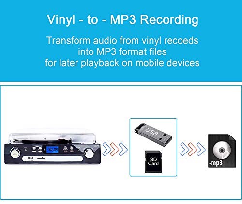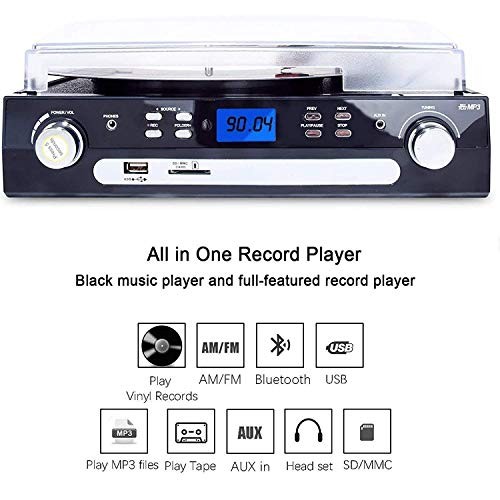 Return Policy Fast Delivery Trusted seller Bluetooth Record Player with Stereo Speakers, Turntable for Vinyl to MP3 with Cassette Play, AM/FM Radio, Remote Control, USB/SD Encoding, 3.5mm Music Output Jack(Black) Product Description Wireless Bluetooth Connection - Turntable with Bluetooth function. Playing music from external device wireless, such as moblie phone, laptop and other bluetooth device USB/SD Encoding - Converts vinyl to USB flash drive/SD card directly in MP3 format. No PC or laptop required. Traditional Music Playing - Cassette Player with eject and fast forward function. Aux in for connecting of other devices(CD,Ipod,Iphone etc) 3-Speed Record Player - Belt-driven turntable fits for vinyl records at different speeds. 33 , 45, 78 RPM selectable. (Please note:Long press around 5 seconds to power on) More Fuction - Built-in stereo speakers. Analog AM/FM stereo radio, LCD Screen with backlight, Earphone jack. With Dust Cover and 45RPM Adaptor.PICHUAPUDARL PTKIHOCOETL GOUGIND Shipping Returns Payment Shipping Shipping is FREE to all addresses other than APO/PO boxes in the lower 48 states. All our stock ships from US-based warehouses. Shipped via USPS or UPS (depending on location and package weight) Unless stated otherwise, all orders will ship within 24-72 hours of your payment being processed. Check our feedback to see the great reviews of FAST shipping we offer. Returns Seller does not accept returns Payment We currently accept payment via eBay managed payments only. Once payment is cleared, we will dispatch your shipment within 1-3 business days. Please refer to the "Shipping" tab for more information regarding shipping speed to your destination.
