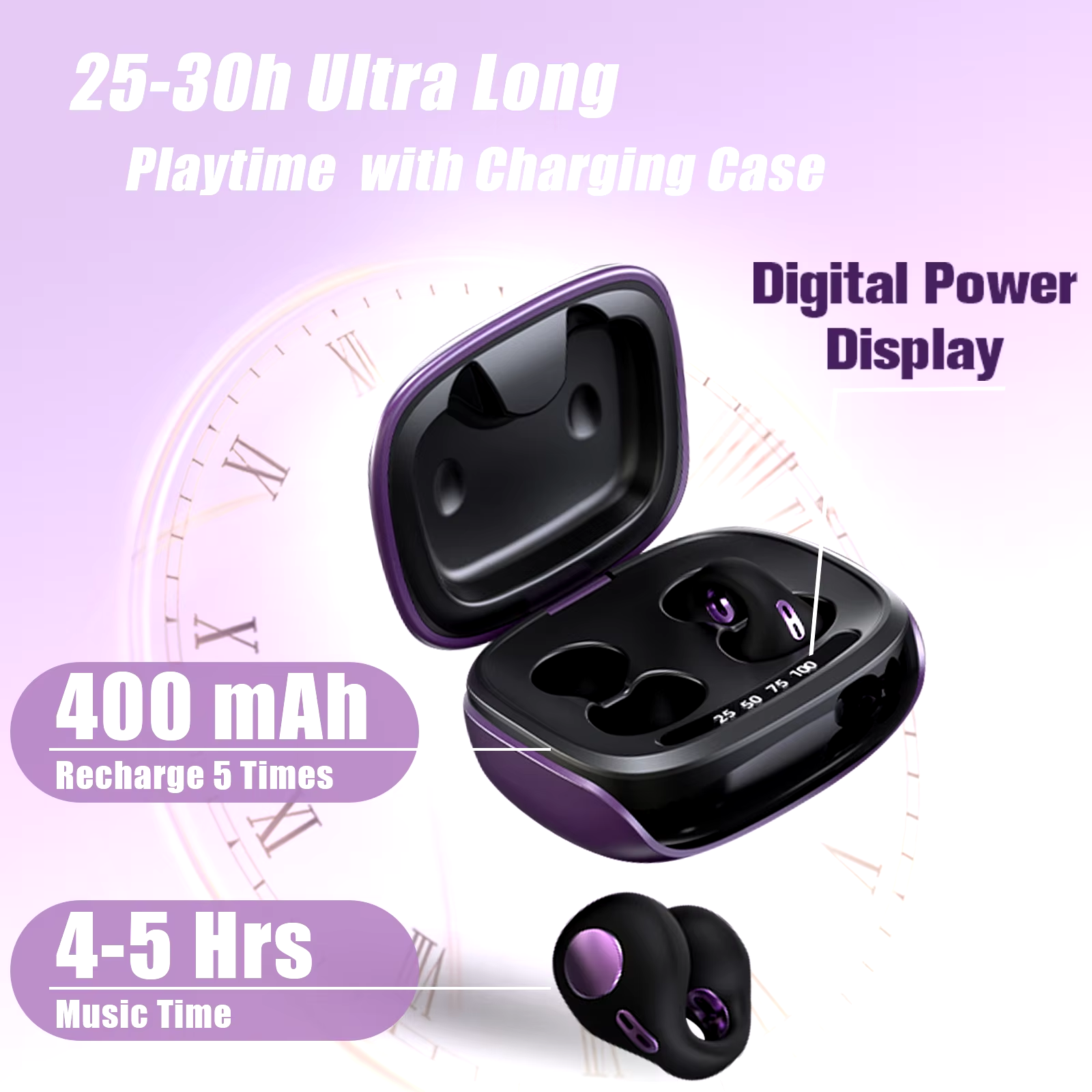 About this item 《Open Ear Safety connection》 In contrast to over ear Earbuds,Open Ear wireless ear clip bone conduction bluetooth headphones allows sound to reach the inner ear through the ear bone,effectively protecting the child's and yours Hearing,Earbuds that don't go in your ear help you have a safer life,stay motivated with your favorite audio while also being aware of your surroundings. 《Random Use Single / Two Earbud》 Upgraded technology allows you to randomly pick one mini earbud (either left or right) for instant use when you are driving on the road or working in the office, with no need to worry if it’s the master earphone and working right away. 《0.13 OZ Lightweight & Soft Wear & Stable Fit》 Our wireless sport earphones clip on headphones made of premium soft silicone,weigh 0.13 OZ,Ergonomic and comfortable,open ear earbuds keeps running relax,Pain-free design.Compared with over the ear headphones, wireless clip on bone conduction running headphones help you Feel free to wear,even if you wear glasses. 《5 Hours Play & Suitable for the Crowd》 Bone conduction headphones bluetooth USB charging and include 400mAh battery, enjoy 5 hours of non-stop music or podcasts,Suitable for people who like outdoor sports, such as running, hiking, cycling, etc.; Open ear headphones are suitable for wearing headphones all day long, need to protect their hearing. 《Clear Call & Premium Sound Quality & Ultra-low latency》 Earclip Bone conduction headphones,Advanced bluetooth 5.3 headset connects to your mobile phone or other devices faster and more stably than Bluetooth 5.0,it can greatly reduce natural sound leakage and offer you a premium sound quality. 2 Built-in microphone achieves clearer phone call,allowing you to hear crystal clear calls like you are communicating face to face with others. 《Automatic Pairing & Smart Touch Control》 Open ear headphones adopts automatic switch. After first connection, wireless ear clip headphones will connect with your device once you open the charging case, which is faster and more convenient. During using, you can touch either earbud to control the phone, such as the music switch, volume adjustment, phone calls, voice assistant, etc.It is compatible with IOS, compatible with Android smartphones, compatible with Macs, computers or laptops.