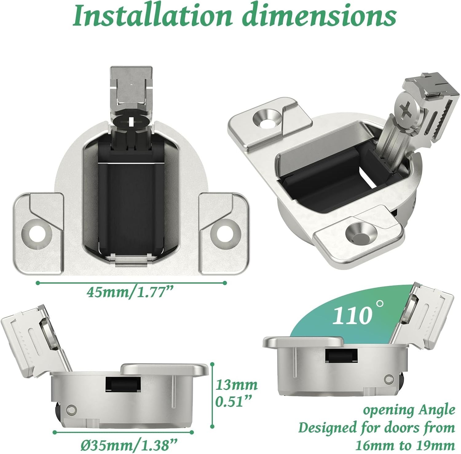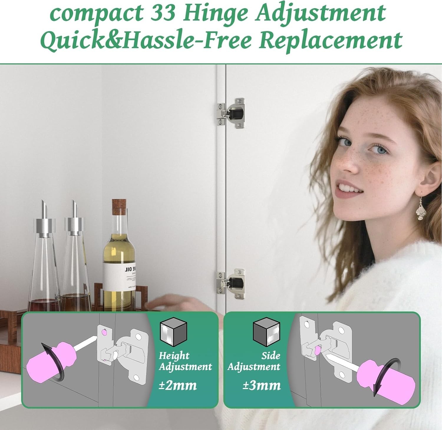 About this item Exact 110° Blum Replacement Hinge Directly compatible with Compact 33 hinges (models 130.1100.22, 130.1130.02, and 30.310-11.02) and most face-frame cabinets. Restores smooth 110° swing motion without costly OEM parts. 5-Minute Installation with Included Hardware Preloaded with enough corrosion-resistant screws (2 per hinge). Use a standard Phillips screwdriver for quick mounting—no drilling required for most cabinets. Industrial-Grade Durability Zinc alloy core with nickel-plated finish resists rust and wear. PA plastic joints tested for 100,000+ cycles—ideal for heavy kitchen cabinet doors. Slim Face Frame Design + Micro-Adjustment range 1/4" lateral and range 9/32" vertical alignment for seamless door gaps. Space-saving concealed hinge fits 16-19mm doors with 35mm cup cutouts. Flexible Configuration Choices Select from 4Pack (2-door repair), 10Pack (complete cabinet upgrades), or 20Pack (multi-door projects). All sets include rust-proof installation screws (mounting plates not included) with dedicated support team assistance. The Blum 110° Cabinet Hinges 20-Pack is a modern, self-closing hinge made of stainless steel and zinc, featuring a nickel finish. It is designed for flush mount installation on room/pass doors. These hinges come in a pack of 20, each measuring 1.5 inches in height, and weigh 2.01 pounds. The package dimensions are 8.7 x 4.13 x 2.99 inches. This product is suitable for home improvement projects in the cabinet hardware category, providing a stylish and durable replacement option for compact 33 screw-in hinges.