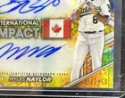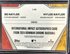 This rare and highly sought-after sports trading card features the autographed labels or stickers of Bo Naylor and Myles Naylor, two rising stars in Major League Baseball. The 2024 Bowman Chrome Int Impact Dual Auto Gold Mini #32/50 card is a limited edition, with only 50 copies available in the world. This card is a must-have for any serious collector, with its stunning Gold Mini Diamond Refractor design and serial numbering. It is an insert, rookie, short print, and chase all in one, making it the perfect addition to any sports trading card collection. The card is manufactured by Bowman and features the logos of the Oakland Athletics and Cleveland Guardians. Don't miss out on the opportunity to own this unique and valuable card!