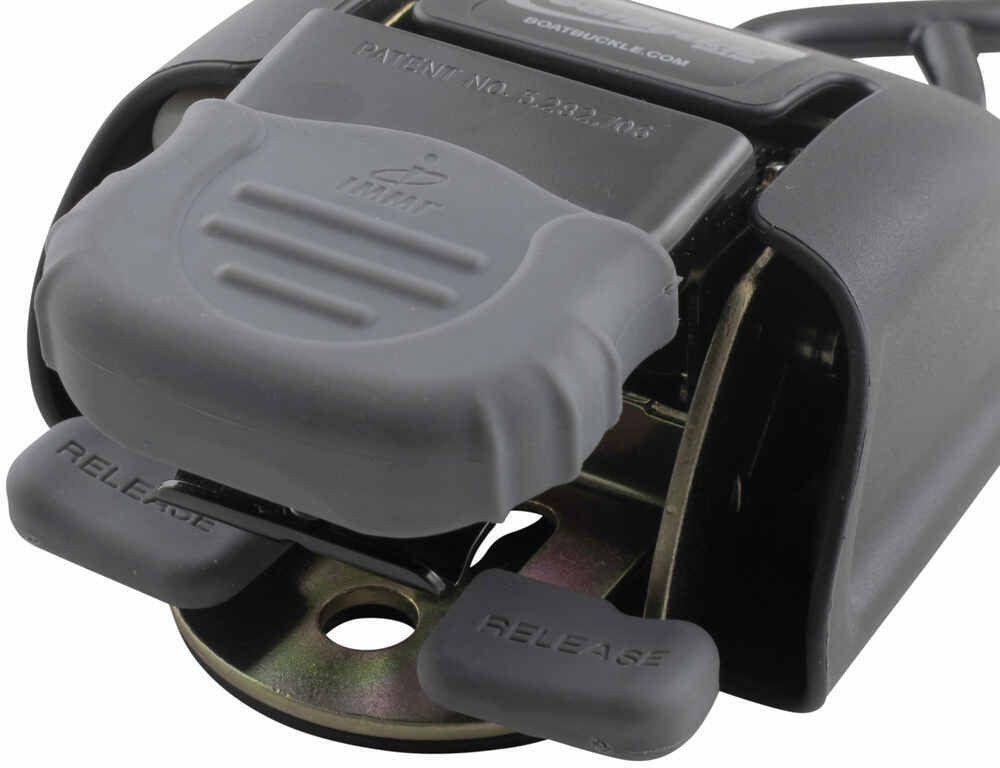 BoatBuckle Boat Tie Downs - IMF08893 Ratchet Strap 0 - 5 Feet Long Retractable 1501 - 2000 lbs 2 Straps BoatBuckle 1-1/8 - 2 Inch Wide S-Hooks Premium 2" wide straps secure your boat's stern to your trailer quickly and easily. Simple to hook up, they retract automatically, and offer a permanent mount, helping you to get on and off the water in a flash. 2,500 lbs Max load. Features: Heavy-duty ratchet strap easily secures your boat's transom (stern) to your trailer Tighten down quickly with SUR-Grip rubber-coated handle - easy to grip and control with one hand Dual-release lever and self-retracting design allow for easy, rapid loading and unloading Unused strap retracts into housing - minimal ratcheting and convenient storage Vinyl-coated steel S-hook helps to protect your boat's paint finish Permanently mounts to your trailer with 1 bolt - mounting hardware included Durable construction offers long-lasting performance Corrosion-resistant steel body Seat-belt-quality polyester webbing Sturdy plastic housing and stainless steel spring Specs: Strap dimensions: 2" wide x 43" long Mounting hardware dimensions: 3/8" diameter x 2" long Maximum load strength (break strength): 2,500 lbs each Safe working load limit (WLL): 833 lbs Quantity: 2 transom (stern) straps 1-Year limited warranty BoatBuckle's second-generation transom tie-down straps bolt to the rear crossmembers of your trailer and simplify the securing and unloading of your boat. They are designed to keep constant tension on the strap and require minimal ratcheting to secure your load. Instead of always having to find and store tie-down straps that hook to the tie-down anchors on the back of your boat, BoatBuckle's straps are always right where you need them. Just pull up on the hook and strap, attach the hook to the transom, and then operate the ratchet several times. No more dealing with extra webbing or looking for the tie-down strap. And when unloading, simply push the release button on the ratchet, free the hook from the transom anchor and let the strap retract back down into the ratchet. Installation These straps come with the mounting hardware that you'll need to install them. It is recommended that you use anti-seize (LT37616 - sold separately) to ensure that the nuts are properly tightened down over the bolts. You can mount the ratchets with the included bolts directly to the trailer frame or crossmember. If you need to angle the ratchet strap or move it a little farther off the frame, a universal mounting kit (IMF14254 - sold separately) is available. Note: Transom tie-downs should always be used along with a winch strap and a pair of gunwale tie-downs. All straps and cables should be chosen according to their safe working load limit (WLL). To determine the maximum load, or break strength, of the strap, simply multiply the WLL by 3. The WLL is always one-third (1/3) of the maximum load. It is recommended that you always use straps in pairs. F08893 G2 Retractable Ratchet Tie Down Straps by Boat Buckle (IMMI) - 43" x 2" - 2,500 lbs - QTY 2 Similar to Fulton F62FV