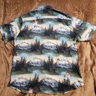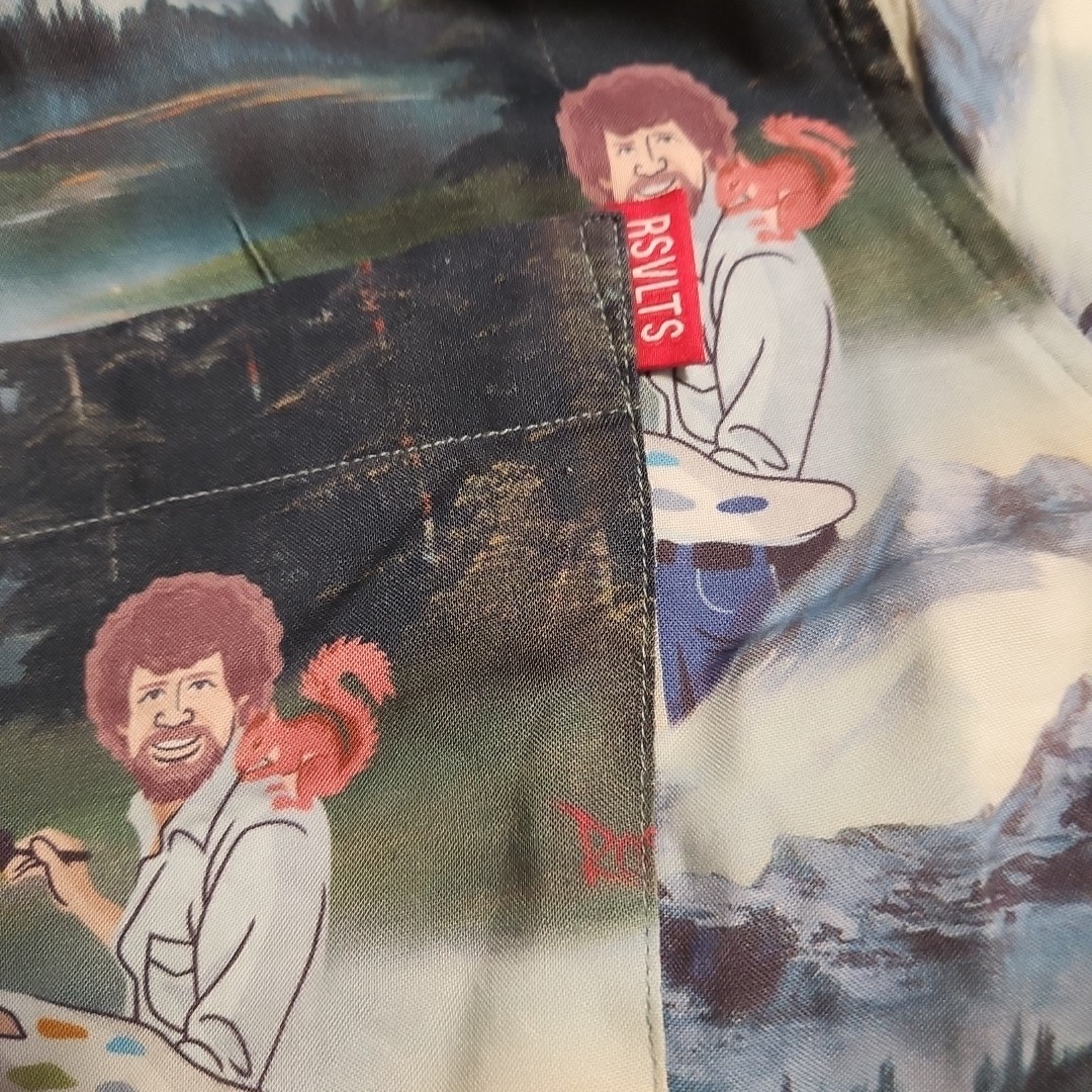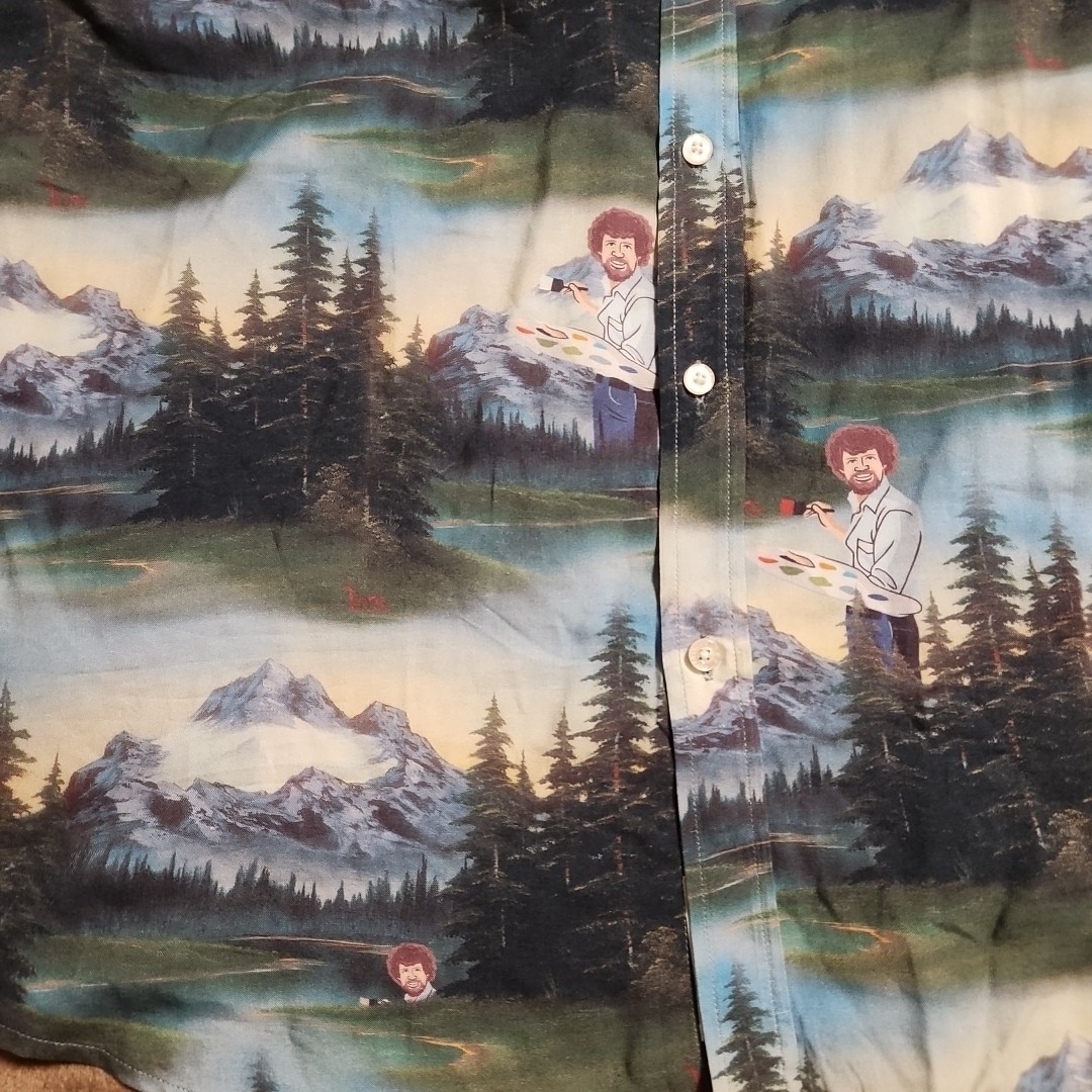 The RSVLTS Bob Ross Shirt is a men's casual button-down shirt in size XL, featuring a Happy Little Trees forest design in multicolor. Made from rayon fabric, this short sleeve shirt is perfect for fans of Bob Ross and those looking for a stylish and comfortable addition to their wardrobe. With its unique character and eye-catching colors, this shirt is sure to stand out and bring a touch of joy and creativity to any casual outfit.