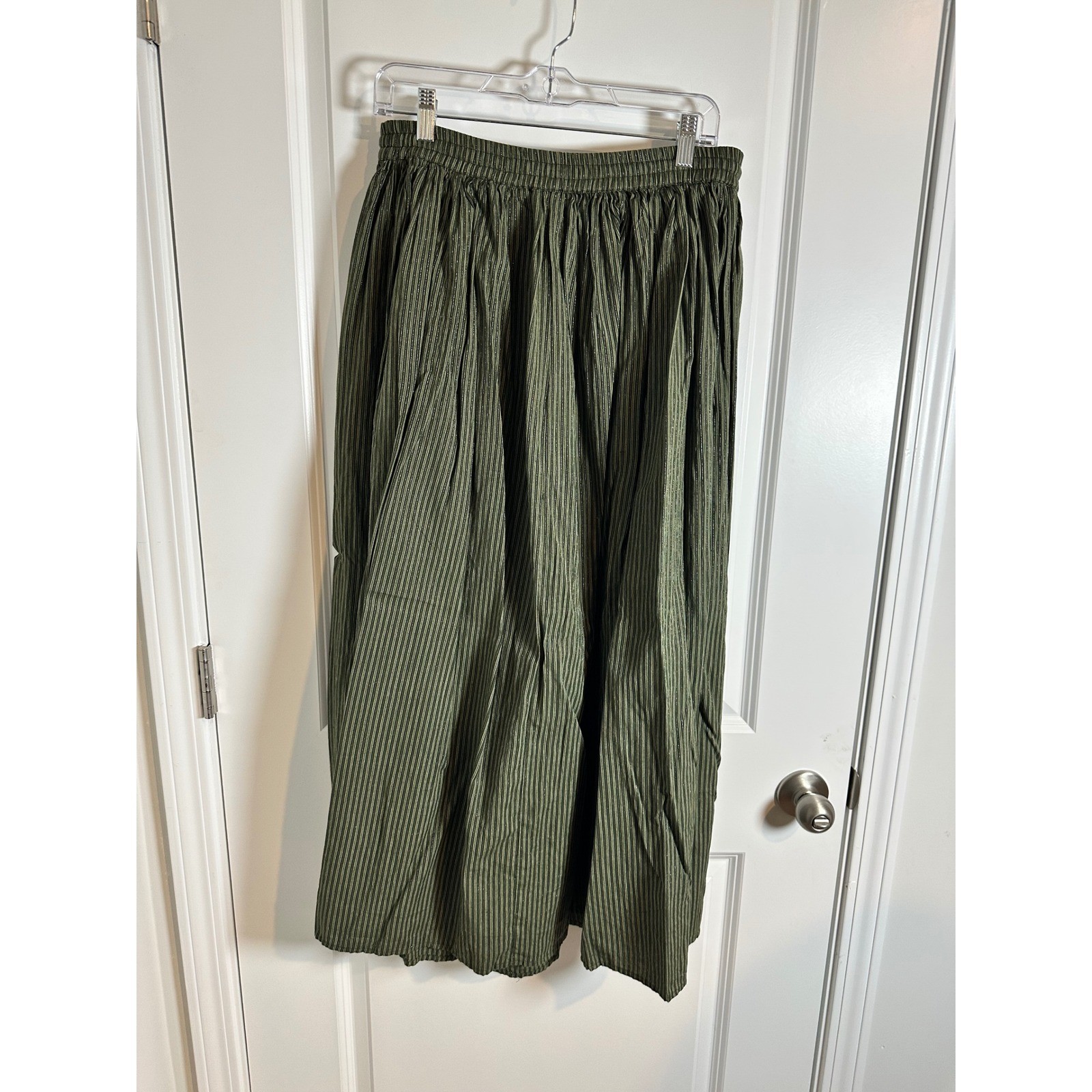 Evokes images of earthy elegance with this vintage Bobbie Brooks skirt. An intriguing metallic thread is woven into a soothing olive green, creating subtle shimmers that catch the light with every move. The relaxed, maxi silhouette and forgiving elastic waistband ensure effortless comfort, allowing you to embrace graceful movement. Its unique hi-low hem adds a touch of modern flair, breaking away from traditional designs to make a distinct impression. Perfect for relaxed brunch dates, garden parties, or weekend strolls, this skirt adds a touch of charm to any occasion. Type: Skirt Style: Maxi Skirt Length: Long Color: Green Department: Women Pattern: Striped Material: Cotton Blend, Cotton, Metallic Fabric Type: Knit Features: Elastic Waist, Lightweight, Asymmetric Character: Bohemian, Retro, Earthy Closure: Pull On Occasion: Casual, Party/Cocktail, Travel Keywords: Bobbie Brooks, maxi skirt, olive green skirt, metallic skirt, vintage skirt, small skirt, elastic waist skirt, striped skirt, boho skirt, retro skirt, hi low skirt, women's skirt, S skirt
