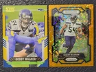 Capture a piece of football history with this set of two trading cards featuring the talented Bobby Wagner. From the 2023 Panini Prizm set, the Orange Disco card sparkles with an eye-catching design, while the 2021 Panini Score Gold card boasts a classic look. Both cards celebrate Wagner's impressive career with the Seattle Seahawks, Los Angeles Rams, and Washington Commanders, as well as his time with the Utah State Aggies in college. Each card is crafted in the United States and showcases standard-size, high-quality card stock. These non-autographed inserts and parallels are must-haves for fans and collectors alike. The cards include English language details and commemorate the exciting Super Bowl event. Add a touch of NFL prestige to your collection with these striking representations of Bobby Wagner's athletic prowess.