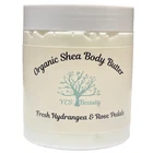 Our handmade Moonlight & Roses Organic Shea Body Butter is a luxurious indulgence for every skin type, offering a truly regal experience. A wonderful scent of fresh hydrangea flowers mixed with rose fragrance. One of our favorites! Crafting our own Body Butter is a process that combines creativity with the finest natural ingredients The outcome is a product that not only moisturizes and soothes the skin but also reflects a personal touch. All jars & bottles are safety sealed by us prior to shipping! We use only safe, recyclable PET 1 bottles! With its irresistibly soft and creamy texture, it envelops your skin in pure bliss. This divine formula absorbs swiftly and completely, leaving no trace of greasiness behind. Crafted with a harmonious blend of cocoa butter and shea butter, it provides an intensely moisturizing treatment that is perfect for your hands, body, and feet, ensuring they stay hydrated and nourished throughout the day. Suitable for every skin type Our body butter was developed at the request of our customers. They asked us for a rich creamy blend that would moisturize without leaving ones skin oily or greasy. After many attempts at different formulas we believe we have come up with just the right combination of luxurious ingredients to give our quality customers the product that fits their needs. We let our ingredients do the talking! Purified Water, Organic Shea Butter, Coconut Oil, High Oleic Sunflower Oil, Cocoa Butter, Extra Virgin Olive Oil, Emulsifying Wax, Glyceryl, Monostearate, Stearic Acid, Jojoba Oil, Cetyl Alcohol, Carbomer, Optiphen Plus, Natural Fragrance Organic Shea Butter - Rich in fatty acids, clears excess oil while restoring moisture. lubricates the skin and creates a barrier to keep moisture in. A nti-inflammatory and healing properties, making it ideal for softening, conditioning, toning, and soothing the skin. Coconut Oil - Moisturizing dry skin, Reduces inflammation, A ntimicrobial properties Cocoa Butter - Works to naturally soothe dry, sensitive skin while reducing and preventing the appearance of scars and unwanted marks Jojoba Oil - Improves the look and feel of skin and hair, soothes irritation, and reduces the appearance of blemishes High Oleic Sunflower Oil - Helps improve skin hydration, reduce inflammation, speed up wound healing and improve skin elasticity. Extra Virgin Olive Oil - Brimming with skin benefits, main benefit is to moisturize the skin by reducing water loss Emulsifying Wax 93725SC - Vegetable based improves the consistency and stability of emulsions. Glyceryl Monostearate - Makes skin softer and smoother. It traps moisture on the skin and hair to prevent dehydration and damage. Stearic Acid - Helps with eczema, inflammation, and moisture Purified Water Cetyl Alcohol - Protects the skin from moisture loss and reduce the ability of allergens and bacteria to affect the skin. Carbomer - Safe for all skin types, carbomers are fluffy white powders that allow other ingredients in your products to work together to get the job done. Optiphen Plus - Broad Spectrem Preservative, versatile preservative is highly effective against a wide range of microorganisms, including bacteria, yeast, and mold. It ensures your formulations remain pristine and safe. F ormulated with sensitivity in mind. It is gentle on the skin Natural Fragrance Oil - A lcohol-free, Phthalate-free, and Vegan-friendly -