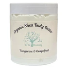 Our handmade Tangerine & Grapefruit Organic Shea Body Butter is a luxurious indulgence for every skin type, offering a truly regal experience. A wonderful scent of grapefruit and tangerines with pomegranate and berry undertones. One of our best fruit blends! Crafting our own Body Butter is a process that combines creativity with the finest natural ingredients The outcome is a product that not only moisturizes and soothes the skin but also reflects a personal touch. All jars are safety sealed by us prior to shipping! With its irresistibly soft and creamy texture, it envelops your skin in pure bliss. This divine formula absorbs swiftly and completely, leaving no trace of greasiness behind. Crafted with a harmonious blend of cocoa butter and shea butter, it provides an intensely moisturizing treatment that is perfect for your hands, body, and feet, ensuring they stay hydrated and nourished throughout the day. Suitable for every skin type Our body butter was developed at the request of our customers. They asked us for a rich creamy blend that would moisturize without leaving ones skin oily or greasy. After many attempts at different formulas we believe we have come up with just the right combination of luxurious ingredients to give our quality customers the product that fits their needs. We let our ingredients do the talking! Organic Shea Butter - Rich in fatty acids, clears excess oil while restoring moisture. lubricates the skin and creates a barrier to keep moisture in. A nti-inflammatory and healing properties, making it ideal for softening, conditioning, toning, and soothing the skin. Coconut Oil - Moisturizing dry skin, Reduces inflammation, A ntimicrobial properties Cocoa Butter - Works to naturally soothe dry, sensitive skin while reducing and preventing the appearance of scars and unwanted marks Jojoba Oil - Improves the look and feel of skin and hair, soothes irritation, and reduces the appearance of blemishes High Oleic Sunflower Oil - Helps improve skin hydration, reduce inflammation, speed up wound healing and improve skin elasticity. Extra Virgin Olive Oil - Brimming with skin benefits, main benefit is to moisturize the skin by reducing water loss Emulsifying Wax 93725SC - Vegetable based improves the consistency and stability of emulsions. Glyceryl Monostearate - Makes skin softer and smoother. It traps moisture on the skin and hair to prevent dehydration and damage. Stearic Acid - Helps with eczema, inflammation, and moisture Purified Water Cetyl Alcohol - Protects the skin from moisture loss and reduce the ability of allergens and bacteria to affect the skin. Carbomer - Safe for all skin types, carbomers are fluffy white powders that allow other ingredients in your products to work together to get the job done. Optiphen Plus - Broad Spectrem Preservative, versatile preservative is highly effective against a wide range of microorganisms, including bacteria, yeast, and mold. It ensures your formulations remain pristine and safe. F ormulated with sensitivity in mind. It is gentle on the skin Natural Fragrance oil - A lcohol-free, Phthalate-free, and Vegan-friendly - comes from natural sources like cucumber, raspberry, and lavender - but how they're made is unique. Plants are made up of multiple aromatic components. For instance, let's look at Bulgarian lavender. Some of its major components are linalyl acetate, linalool, b-caryophyllene, and terpinen-4-ol. All together, they give lavender its signature floral scent.