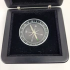 This is a hinged velvet lined case with a 787 First Flight challenge coin and a compass. They are both removable from the case. The challenge coin is 1.5" wide and the compass is 1.75" wide. The case is 3.5" x 3.5" x 1 3/8"