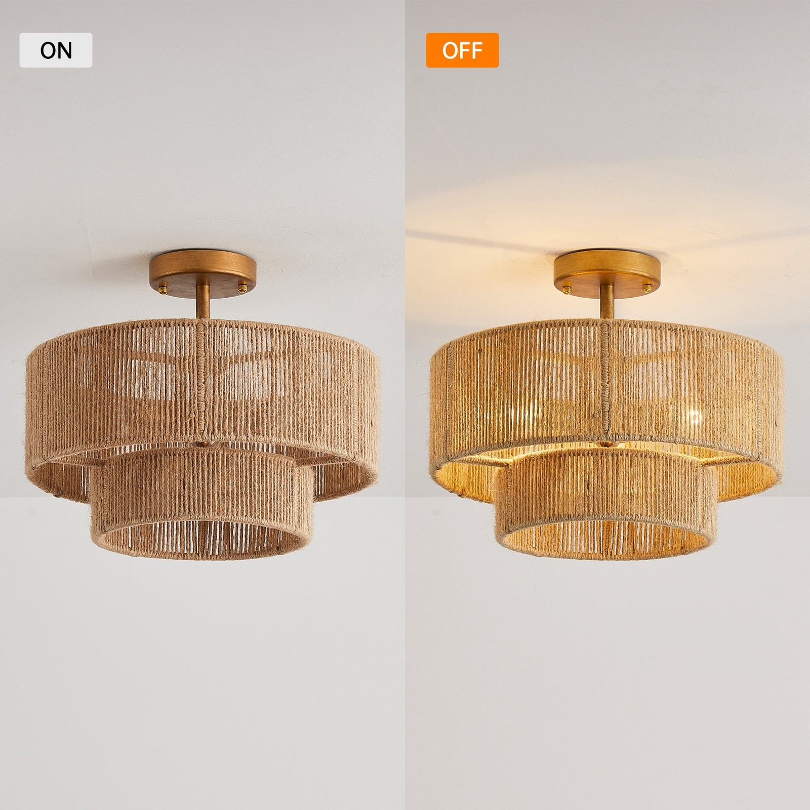 Add a touch of rustic charm and coastal-inspired elegance to your home with the Bohemian Brown Hemp Rope 3-Light Semi-Flush Mount Ceiling Light. Featuring a beautifully woven hemp rope design, this light fixture offers a unique blend of natural texture and warm, earthy tones. The three exposed bulbs, framed within a sturdy circular base, create a soft, ambient glow that enhances any rooms decor. Perfect for living rooms, dining areas, kitchens, or entryways, this semi-flush mount ceiling light brings a relaxed, yet stylish feel to both modern and boho-inspired spaces. Features: Semi-flush mount light made of hemp rope and metal Woven brown hemp rope fit for farmhouse, bohemia, and modern 15.4" fixture width x 12.6" fixture height Canopy 4.7" width 4.2 pounds product weight Use three Free Shipping Over $49.99* Details Bohemian Brown Hemp Rope 3-Light Semi-Flush Mount Ceiling Light - 15.4" W x Product Description: Add a touch of rustic charm and coastal-inspired elegance to your home with the Bohemian Brown Hemp Rope 3-Light Semi-Flush Mount Ceiling Light. Featuring a beautifully woven hemp rope design, this light fixture offers a unique blend of natural texture and warm, earthy tones. The three exposed bulbs, framed within a sturdy circular base, create a soft, ambient glow that enhances any rooms decor. Perfect for living rooms, dining areas, kitchens, or entryways, this semi-flush mount ceiling light brings a relaxed, yet stylish feel to both modern and boho-inspired spaces. Features: Semi-flush mount light made of hemp rope and metal Woven brown hemp rope fit for farmhouse, bohemia, and modern 15.4" fixture width x 12.6" fixture height Canopy 4.7" width 4.2 pounds product weight Use three maximum 40-watt E12 Type-B bulbs (not included) Compatible with dimmer switch (NOT included) Perfect for indoor spaces like kitchens, bedrooms, living rooms, dining rooms, and entryways Low-profile mounting for use in rooms with ceilings less than 9' Easy installation and durable metal base