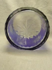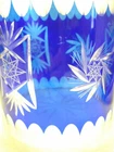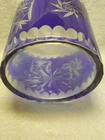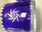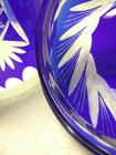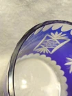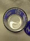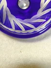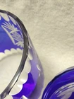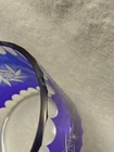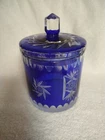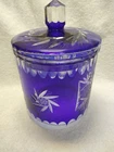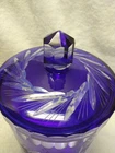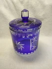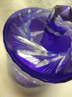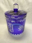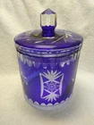 Bohemian Cut to Clear Cobalt Blue Large Biscuit Jar, Cannister, or Ice Bucket with lid. 9.5 inches tall, 6 inches across. I washed it once, but it still has smudges. Several small chips around bottom of lid and top of piece, bottom looks ok except smudgy. Please look closely at pictures. It weighs 4 lbs, 12.9 ounces.