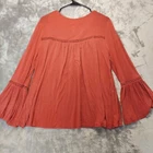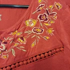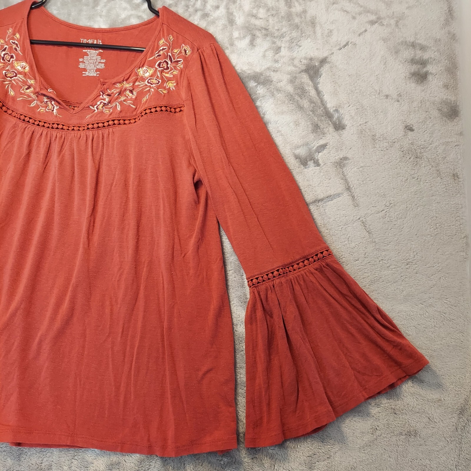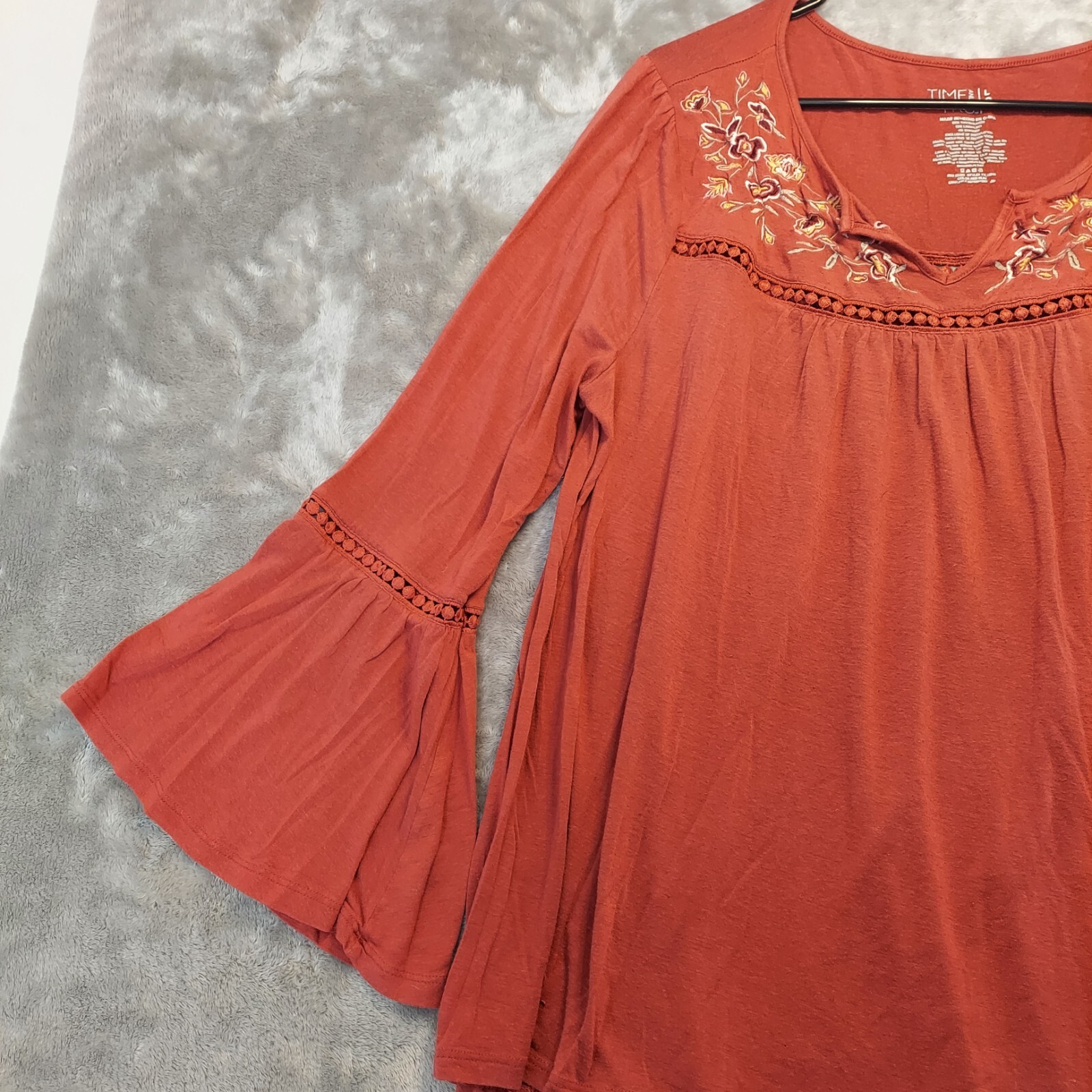 The Time and Tru Boho Peasant Long Sleeve Embroidered Top in size L(12-14) is a stylish tunic blouse in Red Rum color, featuring a round neckline with bell sleeves. Made from a lightweight and stretchy jersey fabric blend of Spandex, Rayon, and Linen, this top is easy to care for with a pullover closure. The floral embroidery adds a touch of charm to the relaxed fit, making it perfect for casual or travel wear during the Fall, Winter, and Spring seasons.
