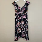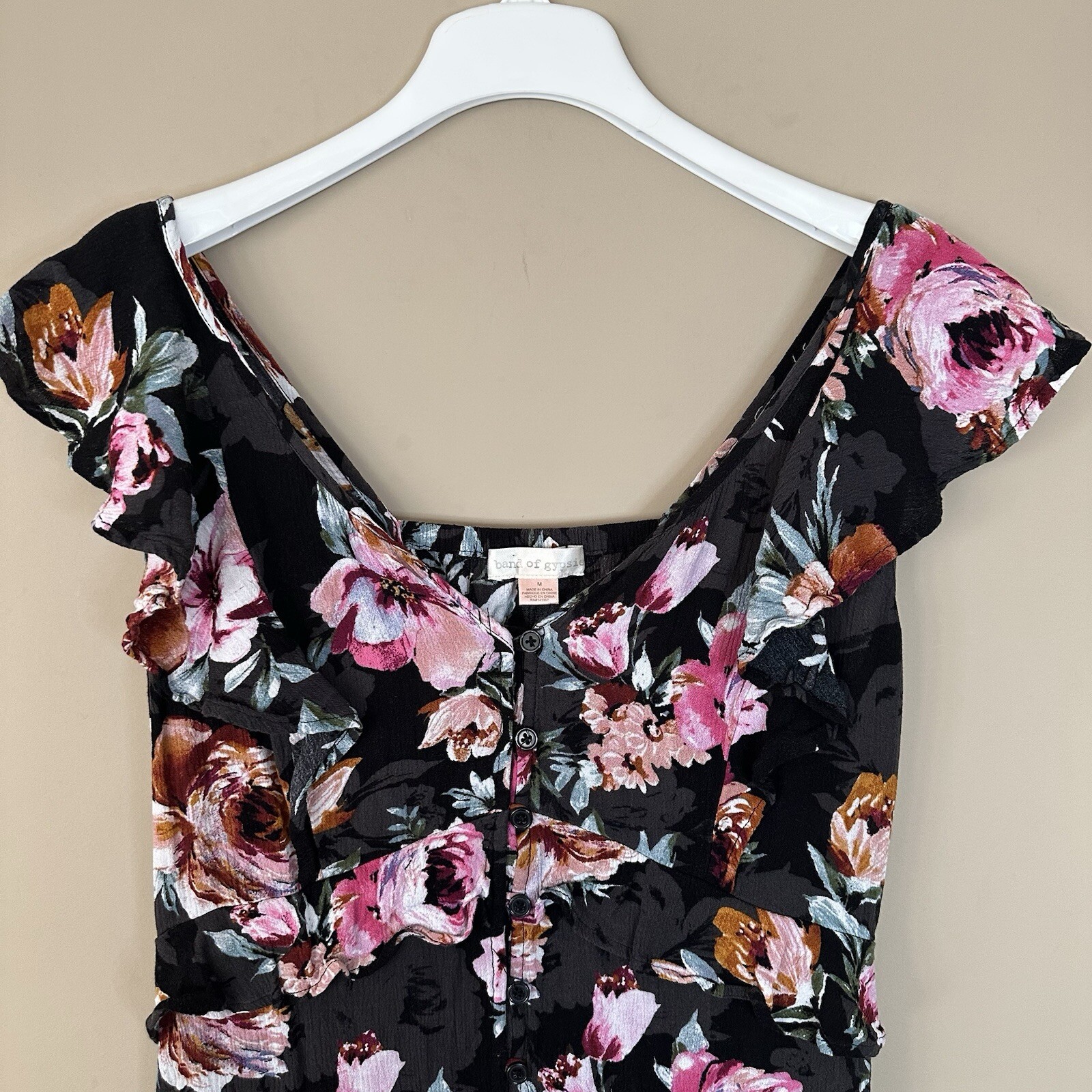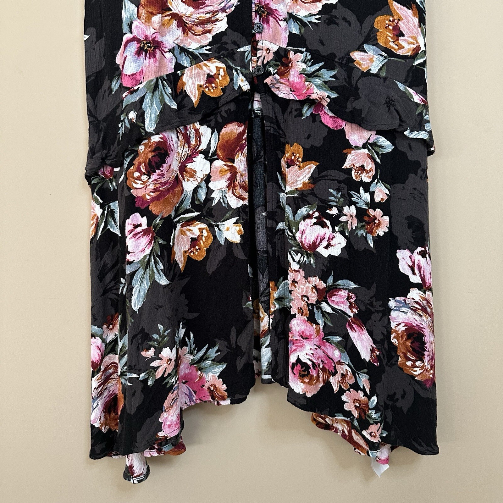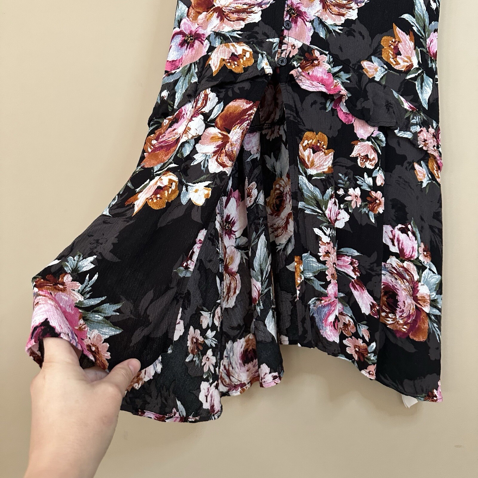 Band of Gypsies Women's Medium Black Floral Midi Dress, Cottagecore, Boho, Babydoll, Beautiful, flowy flower dress with some much attention to detail and a dark coquette style. wide v-neck & a scoop back sleeveless with ruffle at the neck and shoulders as well as the high empire waist and at the thighs. small buttons all the way down the front shark bite hem with a slit with a 14" center slit in the front tie (bow) at the front of the neck and the back of the waist excellent condition tags: sundress spring summer wardrobe garden party feminine wedding guest approximate measurements lying flat length: 44" from the shoulder to the shortest part of the hem armpit to armpit: 19.5" striaght across waist: 15" straight across hips: 18" slit: 14" 📦 Packaged with care 📬 I will ship it out within 2 business days 🙂 Smoke free home ♥️ Offers welcome.