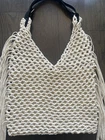 Stylish boho macramé shoulder bag with long fringe detailing and a comfortable black handle. Handmade crochet design gives it a unique, trendy look — perfect for everyday wear, summer outfits, beach trips, festivals, or casual city style. Lightweight, soft, and spacious enough for daily essentials. Condition: new Color: cream Material: Macramé / woven cord with faux leather handle Size (approx.): • Height: 45 cm • Width: 33 cm • Handle drop: 37 cm • Depth: 2 cm (flexible due to the woven structure) Features: ✔ Handmade crochet texture ✔ Long boho fringe on both sides ✔ Lightweight & comfortable ✔ Perfect for summer and travel