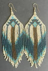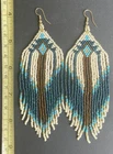 1 pair of long cream, brown and blue seed bead beaded earrings. You will receive earrings pictured. The earrings are made with seed beads. The earrings are approximately 5" long with the ear hooks included. They are for pierced ears. 0-ea-seed4-1