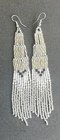 1 pair of long silver and white with black long seed bead beaded earrings. You will receive earrings pictured. The earrings are handmade with seed beads. The earrings are approximately 5" long with the ear hooks included. They are for pierced ears. 0-ea-seed-024-1