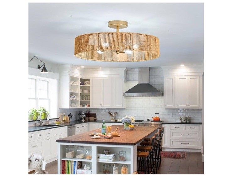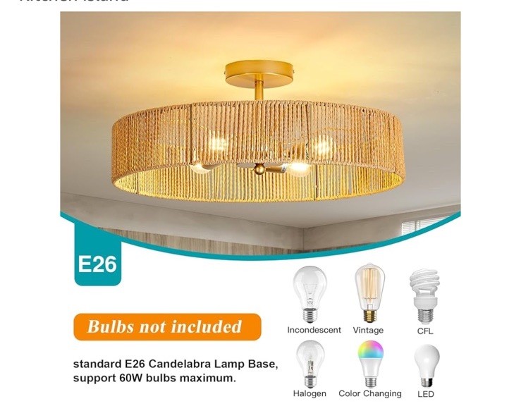 Open box new item! BOHEMIAN INDUSTRIAL DESIGN: This rattan close to ceiling light is made of hand-woven natural rattan wrapped in a metal cage which is made of golden iron. Paired with a hand-woven rope shade, the overall design brings a rustic and at the same time unique and elegant style will bring a modern bohemian flavor to your room. Mid Century Modern Ceiling Chandelier Size: L 19.68 inches , 8.26 inches high. Large chandelier for farmhouse, entrance, bedroom, kitchen, dining room, living room, balcony, foyer, entryway, hall. Compatible with a wide range of light bulbs: Safety and energy saving.Hold 4*E26 lamp base, support 60W bulbs maximum. LED or CFL Edison bulbs dimmer bulbs are all compatible with this light fixture. (BULB NOT INCLUDED) Simple Installation: We provide the installation manual of the lamp.You can also refer to our installation video before installation,simple and easy to use.