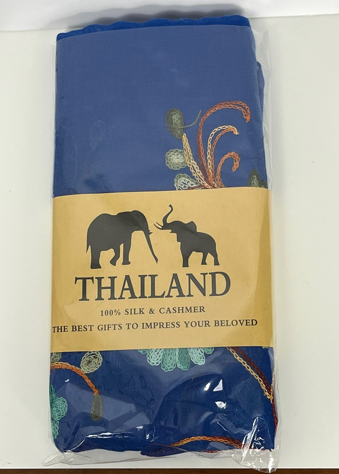New in package Thai scarf in solid blue with machine-embroidered floral designs at both ends. Soft, lightweight, and semi-sheer — perfect as a shawl, head wrap, or layering piece. Measures approx. 74 inches long by 26 inches wide. Material unknown but feels airy and smooth. Made in Thailand, ships from USA. Unworn; removed from packaging for photos only.