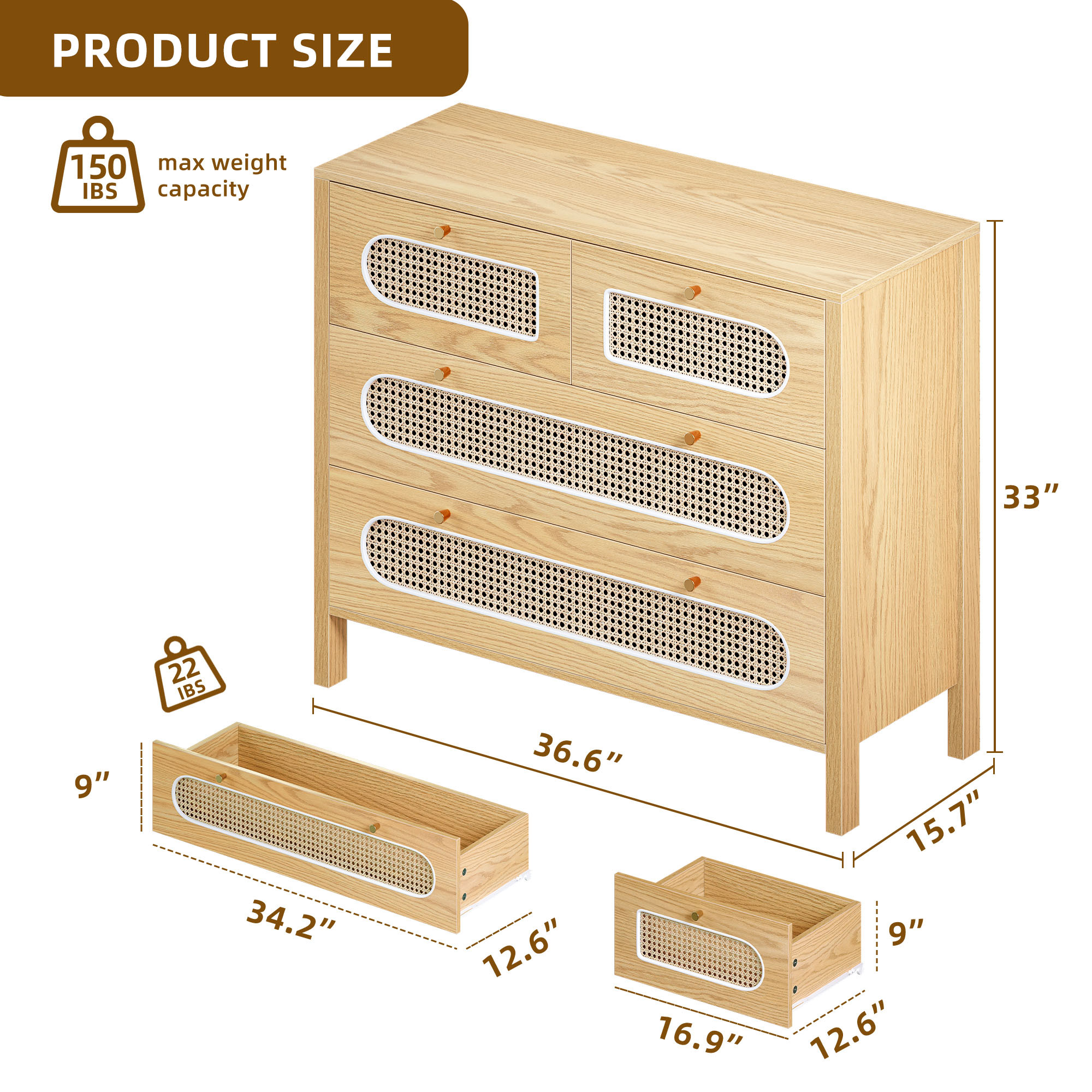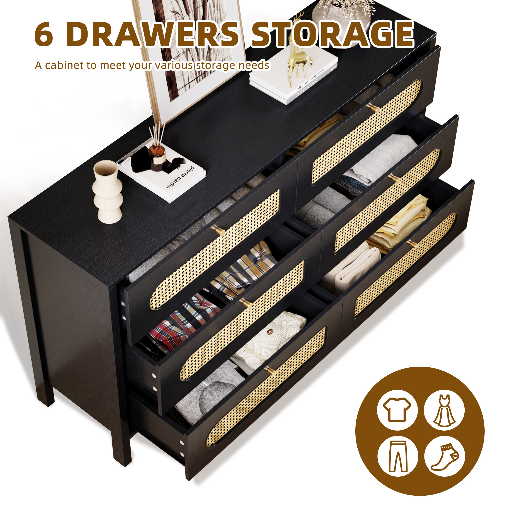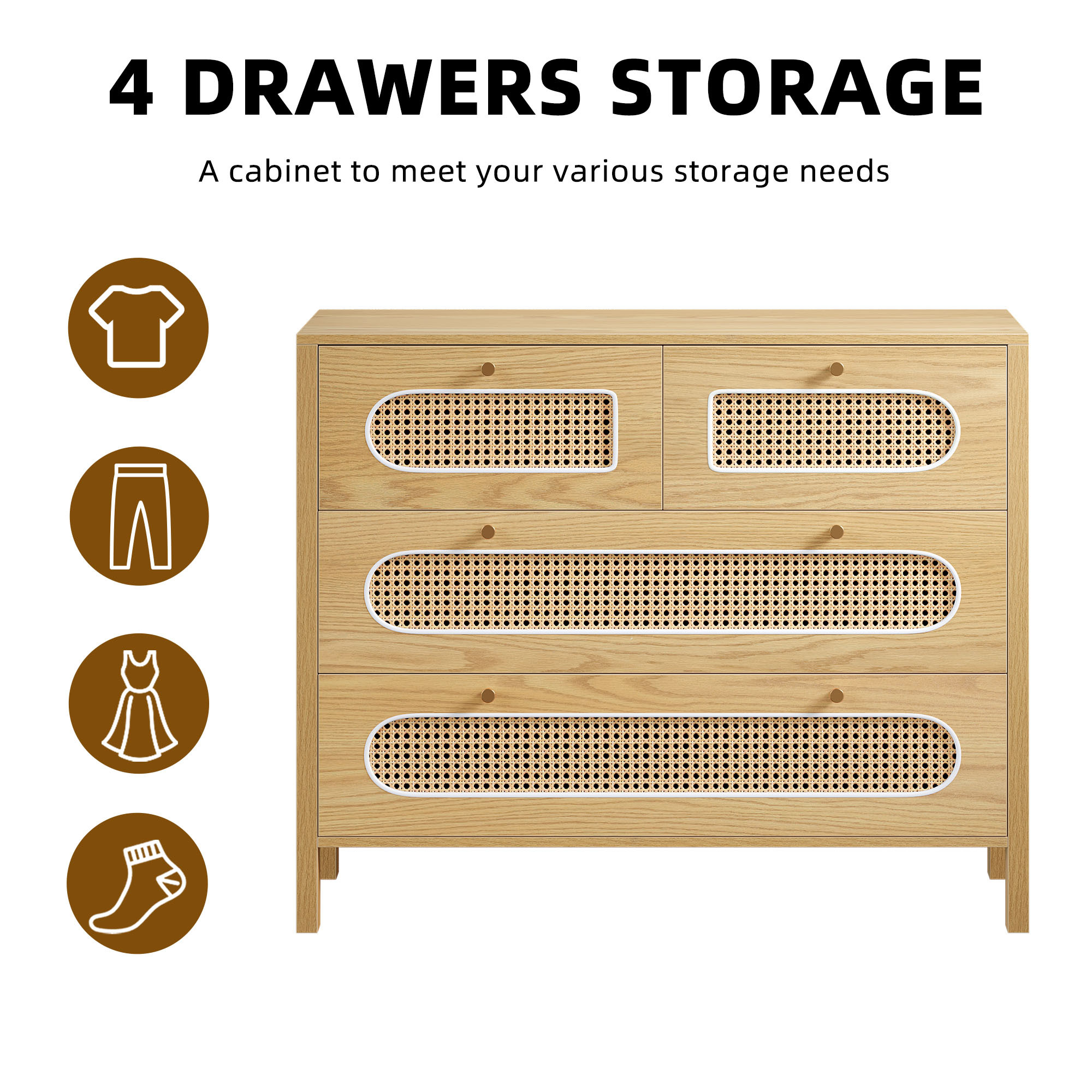Wooden Rattan Dressers Chest of Drawers Closet Boho Storage Cabinet for Living Room/Hallway/Entryway/Bedroom Item Description: Features: The boho rattan dresser features a natural rattan weaving and golden handles, which enhance its visual appeal and create a warm, inviting atmosphere, making it suitable for various indoor styles. The breathable octagonal hollow rattan door adds a unique touch to the design, making it a versatile piece that can complement any decor. The rattan wood chest of drawer dresser comes with a paper version manual and accessories, providing step-by-step and numerical illustrations to guide users through the assembly process, alleviating any worries or concerns. The dresser's construction allows for easy assembly, ensuring a hassle-free experience for customers. The natural rattan material used in the dresser's construction allows for enhanced breathability, making it a practical and functional addition to any living space. Package Includes: 1 x Rattan Wooden Dresser 1x Installation Manual More Display: Shipping ● The shipping rates listed are only for residential or commercial destinations in the continental 48 United States. All international sales will go through eBay Global Shipping Program.please ask us if there are any questions. ● We only ship the item to the address that is sent to us at the time of checkout. Please verify the correct shipping address in your PayPal account before making your payment. If we ship your item to an old or invalid address and you are not able to locate the item, we are not responsible for shipping a replacement. ● Currently, we do not ship to Hawaii, Alaska, Puerto Rico,APO/FPO/PO Boxes. ● We use USPS, UPS & FedEx as shipping method. ● Payments cleared before 12 PM PST, will be shipped on the same day. Payment ● We accept PayPal and all forms of credit card. ● We will only ship to the confirmed Paypal shipping address given with the payment. ● We do not offer local pick up service. Return ● 30 days Money Back Guarantee. ● If any package that needs to be returned, please contact our customer service first to receive a RMA form. ● All return items MUST be in brand new condition. About Us ● Specialized in aftermarket auto parts since 2012, we source and work directly with professional manufacturers to provide the highest quality parts at the most economical prices. ● We also has over 5 years of shipping experience with FedEx and USPS . Our Packing Quality is Guaranteed , Item Ship-ping is timely! On Jun 16, 2023 at 05:48:44 PDT, seller added the following information: On Jan 14, 2025 at 20:11:16 PST, seller added the following information: On Feb 24, 2025 at 19:42:43 PST, seller added the following information: