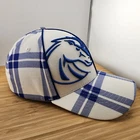 The Boise State Fitted Hat is an officially licensed NCAA product by Zephyr, featuring a plaid design in blue and white. This unisex adult cap is size XL and made in Bangladesh. It is a vibrant accessory for fans of the Boise State Broncos, perfect for wearing during the regular season to show team spirit.