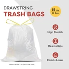 STRETCH MATERIAL - Made of 2 mil extra thick flexible plastic, which is stretch enough to make these trash bags sturdy even overfilled, reliable for your daily sanitary disposal LARGE CAPACITY - These 15 gallon garbage bags are sized at 25.2 x 30.3 inches, will fit 13 gallon, 14.5 gallon, 15 gallon and 16 gallon trash cans with opening circumference of less than 47.5 inches and height less than 26.3 inches, slightly larger than the regular name brand tall kitchen trash bags, which makes it easy to line the entire can and hold more trash DRAWSTRING CLOSURE - Designed with easy to use drawstrings, making these trash bags convenient for lifting, tying, and carrying, this smart design also helps to control odor and eliminate smells in the kitchen. The perforated rolls also brings an easier dispense experience STRONG & RELIABLE - These ultra thick 15 gallon trash bags provide great strength and strecth, resistance to leaks, punctures and rips MULTI-PURPOSE - These garbage bags are suitable for square and round shape trash cans, great for kitchen, yard, office and commercial waste, they can be also used for household storage and laundry room VALUE PACK - Includes 3 rolls / 60 bags in total