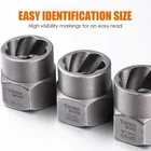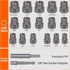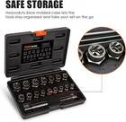 Bolt Extractor Kit, 18 Pieces Bolt Extractor Set, Stripped Bolt Extractor for Removing Damaged, Frozen, Rusted, Rounded-Off Bolts, Nuts & Screws Each bolt extractor is made of high hardness chrome-molybdenum steel for superior durability and longer life. It will easily extract damaged bolts, nuts, and screws even if they are stripped, rusted, or frozen. The internal thread with reverse spiral flutes design to bite down to provide maximum gripping power, the more you turn, the tighter the socket grips. Standard 3/8-inch drive and hex adapter to let the extractors compatible with common to heavy-duty power tools, drivers and screwdrivers handle tools. The knockout pin for easier removal. 18 pieces 3/8 inch drive bolt & nut remover comes with 3/4"(19mm), 11/16", 17mm, 5/8"(16mm), 9/16", 14mm, 13mm, 1/2", 12mm, 7/16"(11mm), 10mm, 3/8", 9mm, 5/16"(8mm), 7mm, 1/4", hex adapter and knockout pin. Heavy-duty blow-molded case lets all the extraction sockets stay organized and take your set on the go. 5 Pcs Lug Nut Remover 6 Pcs Lug Nut Remover 10 Pcs Lug Nut Remover 13 Pcs Lug Nut Remover 24 Pcs Damaged Screw Extractor Set Add to Cart Add to Cart Add to Cart Add to Cart Add to Cart Customer Reviews out of 5 stars 2,616 out of 5 stars 2,616 out of 5 stars 2,616 out of 5 stars 2,616 out of 5 stars 249 Price $$ $$ $$ $$ $$ Material Cr-M Cr-M Cr-M Cr-M HSS 6542 Drive Size 1/2" 1/2" 1/2" 1/2" / Storage Case ✓ ✓ ✓ ✓ ✓