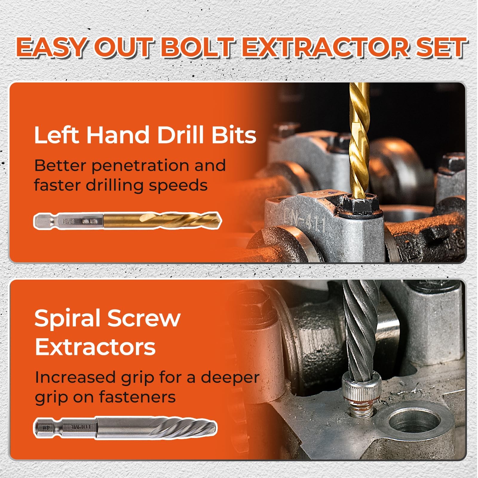 The stripped screw extractor is a comprehensive tool kit designed to help professionals and DIY enthusiasts easily remove damaged studs, bolts, and screws. This bolt extractor set is perfect for various applications such as automotive repairs, construction projects, and household maintenance. The reverse drill bit extractor set includes different pieces, each specifically designed to tackle different sizes and types of damaged fasteners. The drill sets features a 3/8" inch drive hex-head, providing a secure grip and compatibility with standard ratchets, sockets, and wrenches. The multi-spline rounded bolt remover tool is the highlight of this set. It is engineered with precision to grip rounded, damaged, or stripped bolts and screws firmly. This allows for effective extraction without further damaging the surrounding materials. Crafted from high-quality materials, the small screw extractor is built to withstand heavy-duty use and provide long-lasting performance. The durable construction ensures that the extractors maintain their shape and grip, even when dealing with stubborn or rusted fasteners. Using the strip screw removal kit is straightforward and user-friendly. Simply select the appropriate extractor from the set, insert it into the damaged fastener, and apply clockwise force to loosen and remove the fastener. The screw extractor kit also comes with a handy storage case, keeping all the pieces organized and easily accessible. Investing in the screw bolt extractor set will save you time and effort when dealing with damaged fasteners. No more frustration or wasted money on expensive replacements - this stripped bolt remover provides a cost-effective solution to remove damaged screws, bolts, or studs with ease and precision.nut and bolt extractor set,ease out bolt extractor,bolt removal tool,stripped bolts,bolt and nut extractor,stripped socket remover,easy out bits,stripped bolt head removing sockets,screw & bolt extractor set,bolt grip extractor,stripped bolt extractor set,stripped bolt extractor kit 🔨 Superior Quality: Each extractor set made from CR-MO steel and HSS 6542 with a maximum Rockwell hardness of 68 HRC, good process performance, high strength and toughness. The inside left-hand design creates a 135° angle for faster tapping while resisting corrosion. ⚒️ Widely Usage:High-density spiral screw extractor set design helps to remove broken bolts, nuts, studs, fittings, threaded pipes and pins faster. The easy outs extractor sets is a flexible aid for everything from automotive work to home design and craft hobbies. 🔩 Easy Removal: With this broken head bolt nut extractor and left-handed drill bit kit, you can simply remove peeling bolts, broken nuts and frozen lug nuts. Damaged bolts can be easily removed from tight spaces, and left-handed drill bits have even saved a mangled bolt head. ⚙️ Versatile Accessories: 63PCS stripped screw removal tool comes with just about anything you might need to resolve a stuck or damaged fastener or bolt. Consists of 5pcs left hand hss drill bits,13pcs multi-spline screw extractor kit,5pcs easy out spline screw extractors,16pcs stripped bolt extractor, 20pcs small screw extractor set and 4pcs compatible adapter. 🔧Easy to Carry: The damaged screw extractor set is well-assembled.The engraved labeling beneath each tool and carrying case keeps everything clean and organized. It is versatile equipment that may be used on bicycles, boats, trucks, SUVs, and other vehicles.