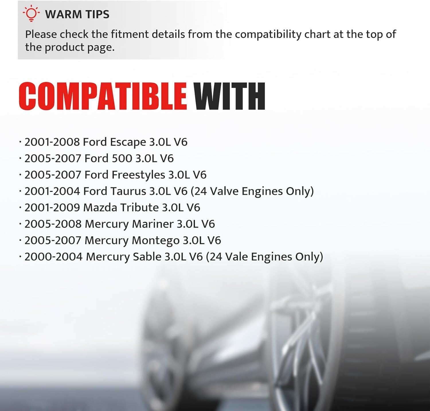 Bolt-On Ignition Coil Pack Set for Ford Escape, Taurus, Mazda Tribute - 6 Piece < class="slides"> ‹ › ‹ › ‹ › ‹ › ‹ › ‹ › ‹ › ‹ › ‹ › ‹ › ‹ › Bolt-On Ignition Coil Pack Set - 6 Piece Enhance the performance of your vehicle with our high-quality ignition coil pack set, specifically designed for compatibility with various Ford and Mazda models. Vehicle Compatibility: Ford Escape (2001-2008) Ford 500 Freestyle (2005-2007) Ford Taurus (2001-2004) Mazda Tribute (2001-2009) Mercury Mariner (2005-2008) Mercury Montego (2005-2007) Mercury Sable (2000-2004) Features: High-Performance Aftermarket Ignition Coils designed for a perfect fit. Solves common engine issues including misfires, rough idles, decreased power, and poor fuel economy. Interchange part numbers include: , AJ0318100, 1L8Z12029AB, and more. Benefits: Improves overall engine performance and drivability. Built with high-quality materials to ensure durability and reliability. Extensively tested for optimal fitment and long lifespan. Backed by a 2-- for your peace of mind. Why Choose Our Ignition Coil Pack Set? Transform your driving experience with our Bolt-On Ignition Coil Pack Set. With its perfect compatibility across multiple models and , this high-performance ignition system is a must-have for anyone seeking to optimize their vehicle's efficiency and power. Say goodbye to engine misfires and rough idles, and enjoy smoother drives and improved fuel economy. Trust in quality, choose our ignition coil pack set, and drive with confidence! Shipping Free & Fast Shipping - We offer free shipping to most of the USA with a normal delivery time of 3-7 days. However, due to the current situation, additional delivery time (up to 3 weeks) may be required for some items. Alternative Carriers - We may use alternative carriers (e.g. USPS, FedEx, UPS, etc.) to ensure your package arrives safely and on time. Due to the use of multiple carriers, we are unable to provide a tracking number automatically. Handling Time - Orders are processed and shipped within 1-2 business days of receiving cleared payment. Shipping Restrictions - Shipping to Alaska, Hawaii, Puerto Rico, Guam, and other US territories may incur shipping charges or delivery restrictions. Please contact us before ordering, or your order can be refunded/cancelled. State Restrictions - There may be restrictions based on your state of purchase. For example, certain items may not be shipped to California due to state regulations. Contact for Tracking Updates - If you require tracking updates or have any concerns about the delivery of your order, please feel free to contact us, and we will be happy to assist you. Return 30-Day Hassle-Free Returns - We want you to be completely satisfied with your purchase. If you are not, you can return the item within 30 days of receiving it for a full refund or exchange. Easy Return Process - To start a return, simply contact us and we will provide you with a prepaid return shipping label and detailed instructions. Restocking Fee - There are no restocking fees for returns. However, the buyer is responsible for return shipping costs if the return is not due to a seller's error. Refund Processing Time - Refunds will be processed within 5 business days of receiving the returned item in its condition. Payment We accept all major credit cards, PayPal, and Apple Pay for your convenience. Your payment information is secure and encrypted to ensure a safe and seamless transaction. Please complete your payment within 3 days of purchase to avoid any delays in shipping. Feedback Your feedback is extremely important to us. We strive to provide the best products and customer service possible. If you are satisfied with your purchase, please take a moment to leave us a positive review. If you have any concerns or issues with your order, please contact us before leaving negative feedback. We are committed to resolving any problems and ensuring your satisfaction. Contact Us If you have any questions or concerns, please feel free to out to our customer support team. You can contact us through the eBay messaging system. We are available Monday to Friday, 9:00 am to 5:00 pm EST, and we will do our best to respond to your inquiry within 24 hours. Buy it now and enjoy a pleasant shopping experience! Coil Type: Coil on Plug (COP) Type: Ignition Coil
