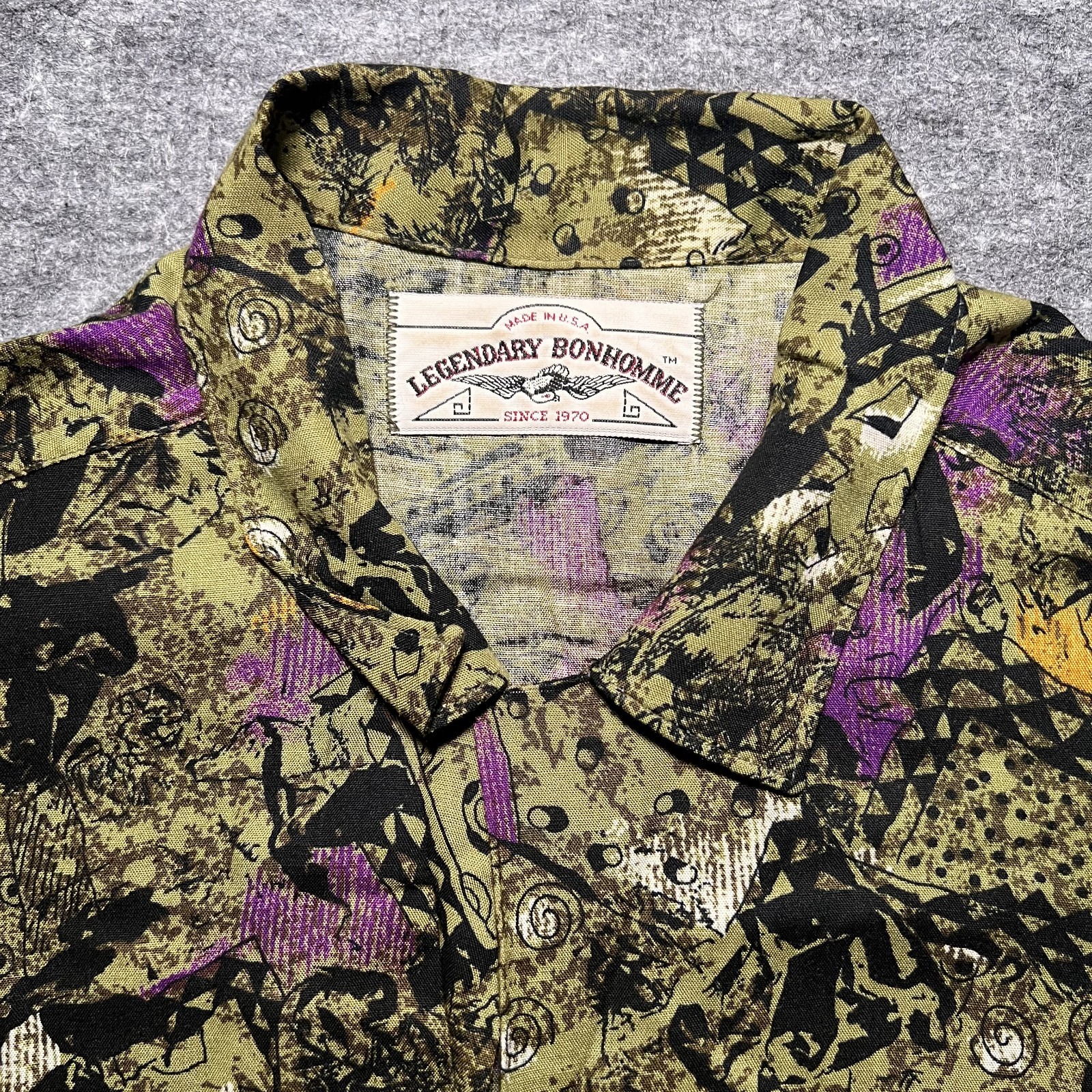 Bon Homme Men Button Shirt Abstract Geometric XL 90s Short Sleeve Multicolor VTG Shirt is in excellent condition as shown in pictures, no size tag, size based off measurements which are so shown in pictures. Feel free to ask any questions about this item, all of our items come from a smoke free environment.