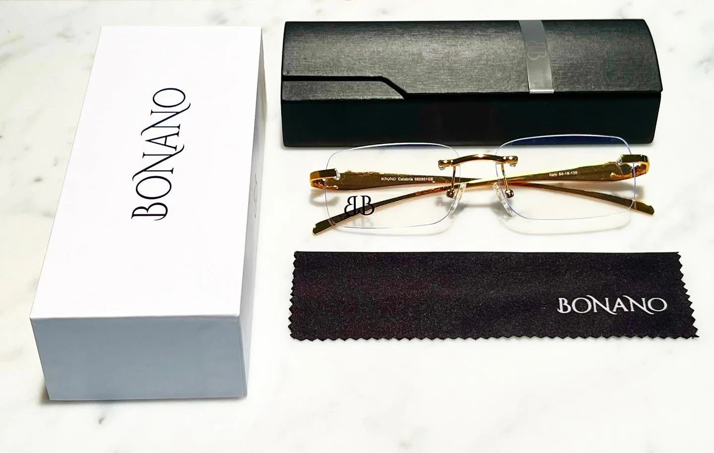 Brand: Bonano Model: Calabria Size: 54-18-140 Color: Gold :Handmade stainless steel construction plated in 18k gold :Handmade Jaguar adorns both left & right temple :18k gold plated metal frame inlay, temple and segments :Bonano Signature logo inlay inner right temple :Bonano CR-39 Non Prescription Clear Demo Lenses. :Comes with Bonano storage box, cleaning cloth, hard-case & frames + lenses :Frame Size 54-18-140 SHARE SHARE ON FACEBOOK TWEET TWEET ON TWITTER PIN IT PIN ON PINTEREST