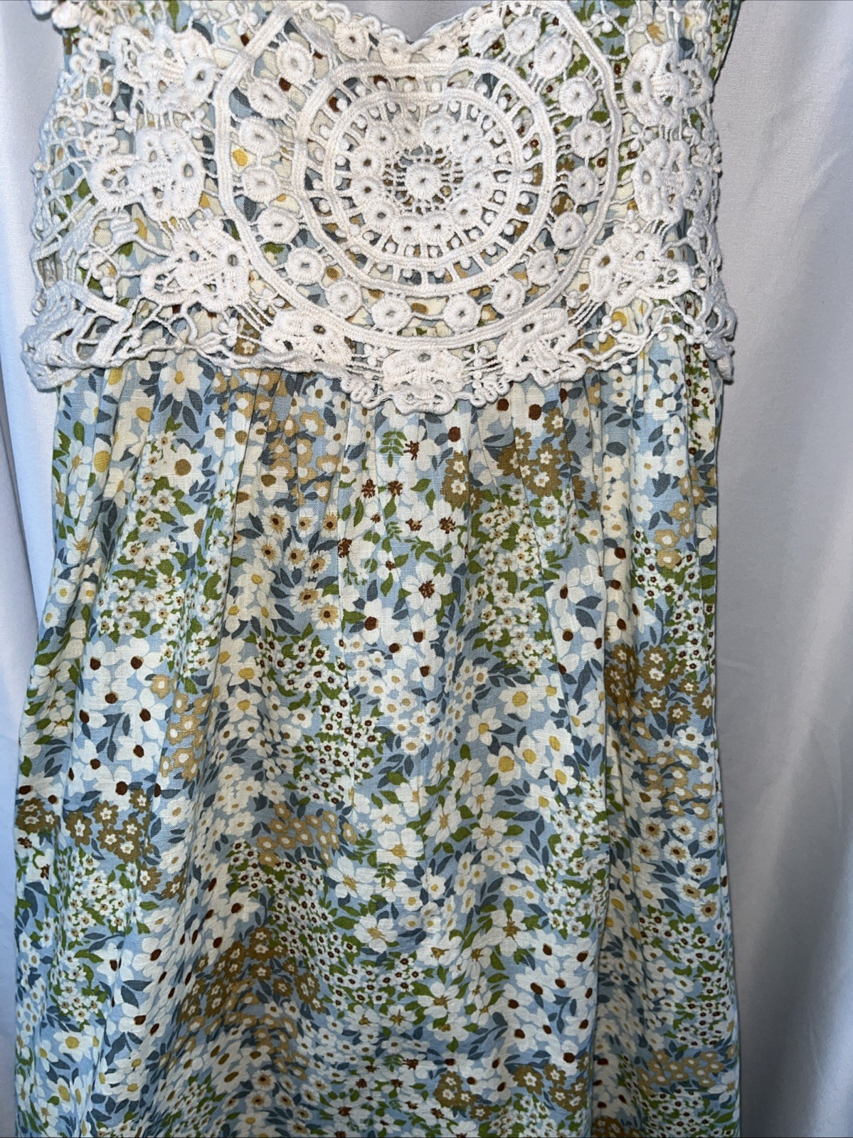 The Bonnie Jean Hayden Girls Crochet Floral Sundress in size 12 is a colorful and whimsical dress perfect for various occasions such as parties, weddings, or casual outings. The dress features a round neckline, short flutter sleeves, and a pullover closure, making it easy to put on and take off. Made from a blend of polyester, spandex, and 100% cotton, the dress is comfortable and stretchy, ideal for all-day wear. The knee-length dress is adorned with intricate crochet accents and a vibrant multicolor floral pattern, adding a touch of bohemian charm to any outfit. Perfect for the summer, fall, or spring seasons. This item had been clean according to EBay policy. (360)