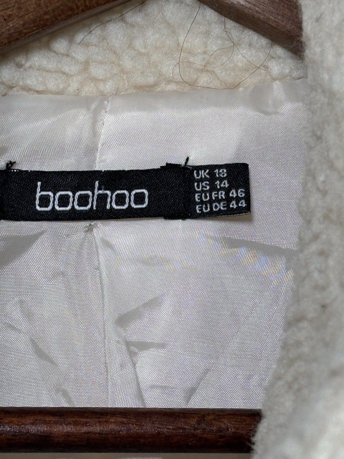 This Boohoo Size 14 Cream Sherpa Teddy Jacket is a cozy and plush winter coat perfect for women. Made from polyester fleece lining, this short jacket features long sleeves and a zip closure for added warmth and comfort. The beige color and relaxed fit make it versatile for various occasions, from casual outings to formal events. With its brand name and stylish design, this jacket is a must-have for those looking to stay cozy during the winter season.
