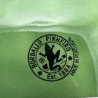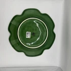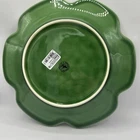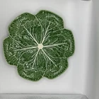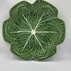 This is a vintage Bordallo Pinheiro chop plate featuring a green cabbage pattern. The plate is made of porcelain or ceramic and was crafted in Portugal. It measures 12 inches in diameter and has a printed backstamp. The design is inspired by vegetables, specifically cabbage, making it a unique and decorative piece for serving purposes.