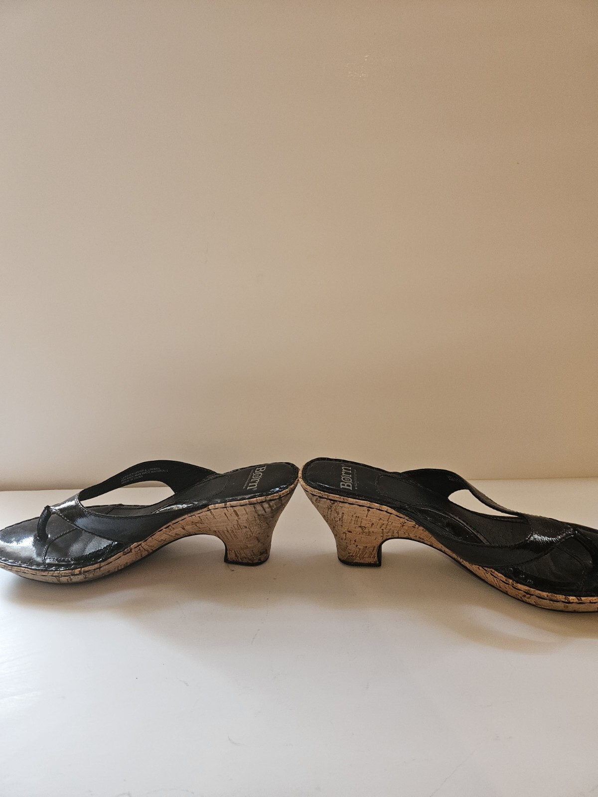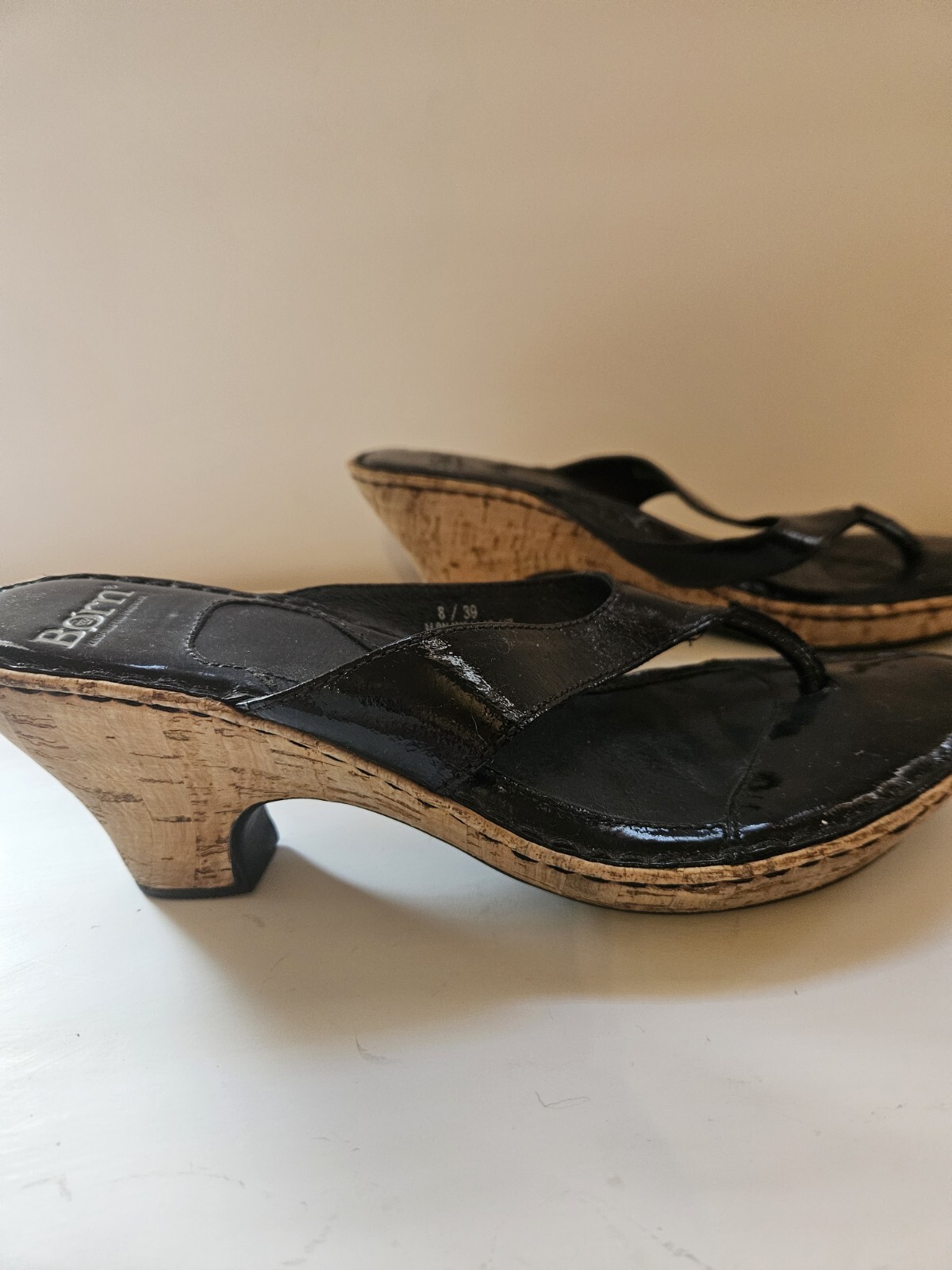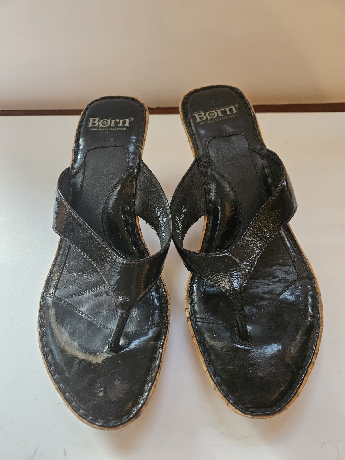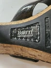 Born Black Patent Leather Wedge Cork Tiki Heel Sandals Womens Size 8 M/W #W31148. Condition is Pre-owned. Shipped with USPS Ground Advantage.