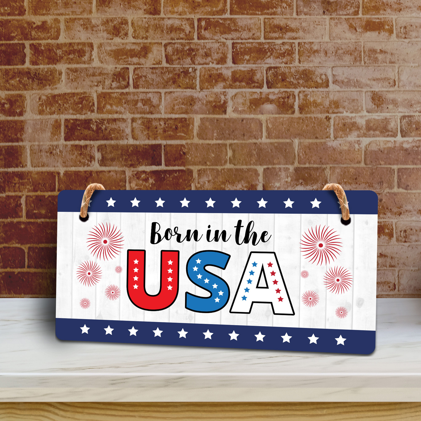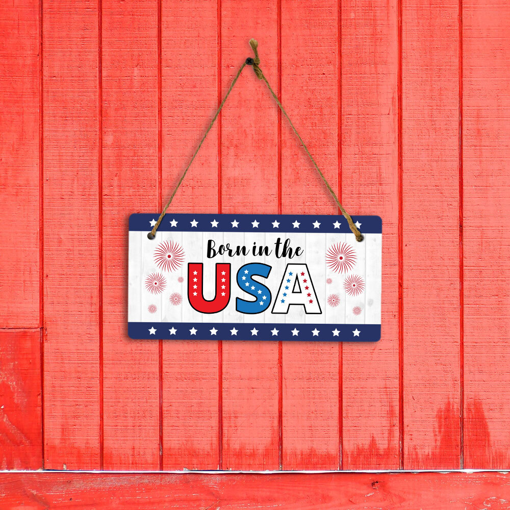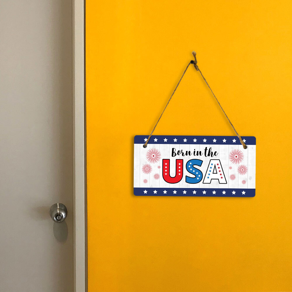 Introducing our versatile and stylish Born In The USA, the perfect blend of style and sophistication to elevate your home or workplace. Our 5x10 Hanging Sign range is the perfect choice for your home, workplace or business. Each sign is attached with rustic twine, providing a charming and versatile accent for any space. Our curated designs effortlessly complement a variety of styles, from rustic farmhouse or Modern Chic, to simple and functional options. Choose from our diverse range of designs to personalize your space. Whether it's a warm welcome at the entrance, a motivational quote for your workspace, or a playful touch for the kids' room, our Hanging Wall or Door Signs are the perfect way to express your unique style.