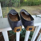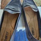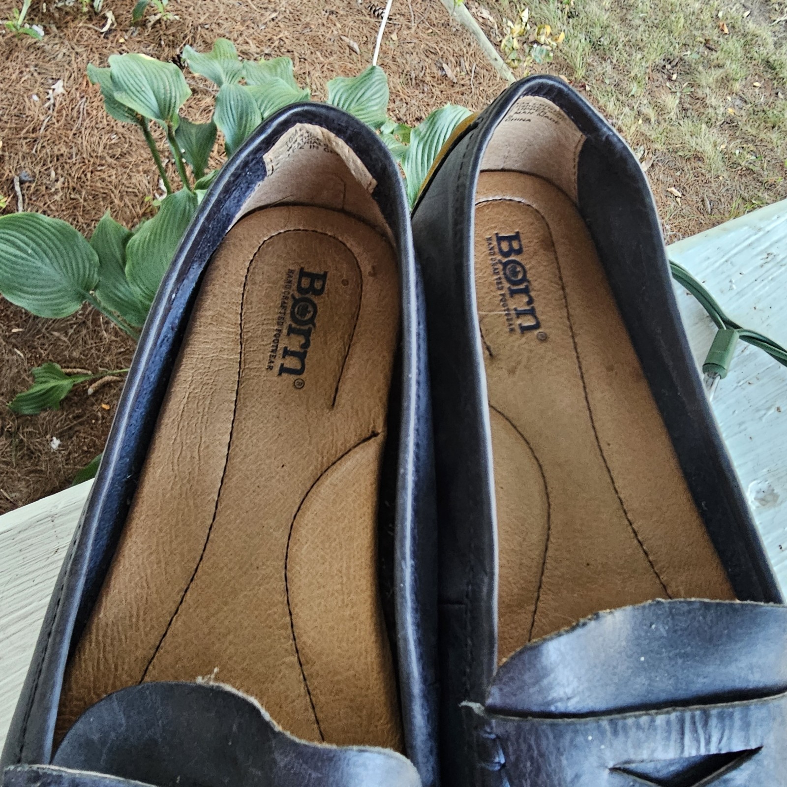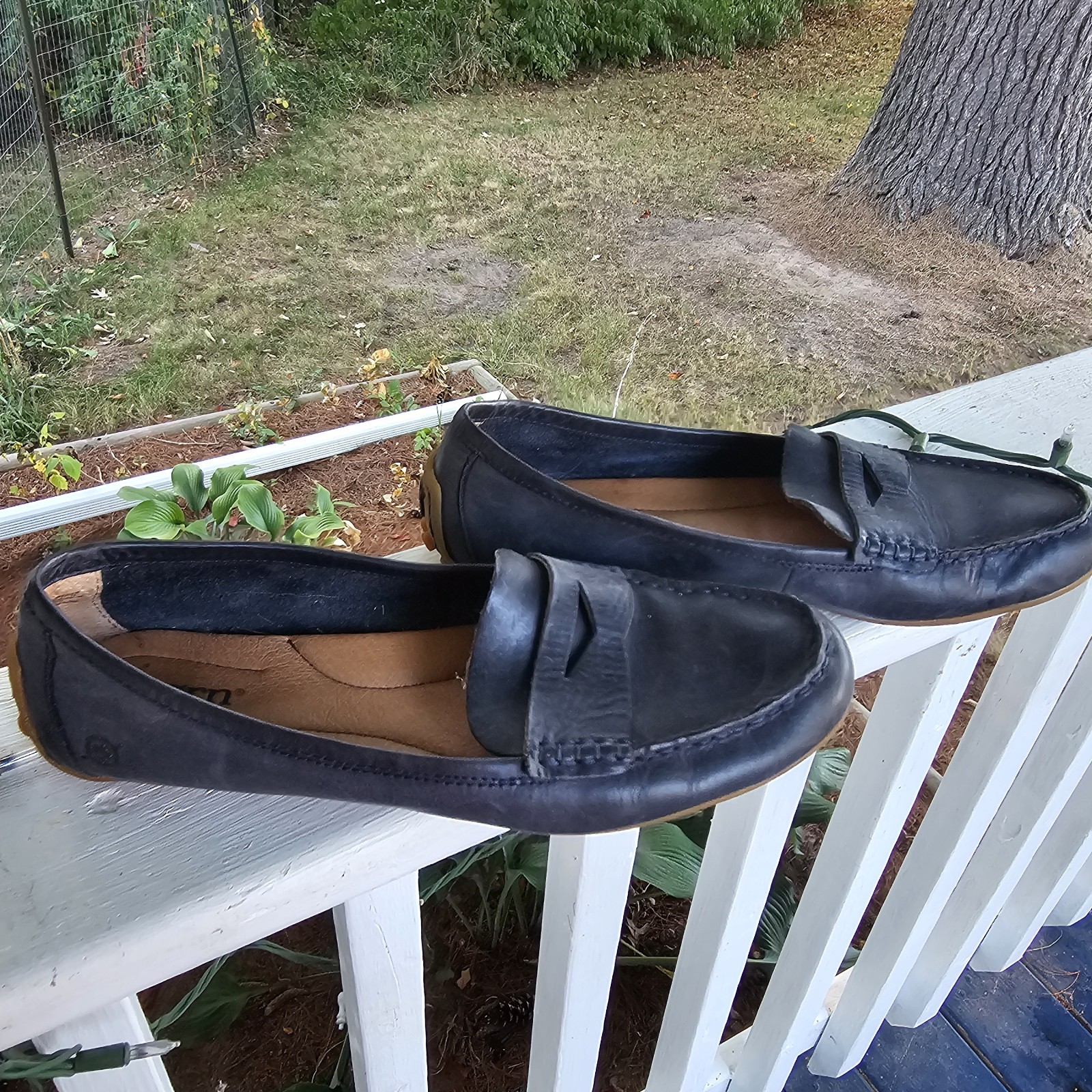 These Born leather loafers are a stylish and comfortable choice for women in size 10. The navy blue color and slip-on closure make them perfect for casual occasions or travel. With a flat heel and rubber outsole, these shoes offer both comfort and practicality. The solid pattern, round toe shape, and moccasin style give them a preppy and city-inspired look, suitable for any season. Made with quality leather, these loafers are a versatile and timeless addition to any woman's shoe collection. See photos for wear sold as is