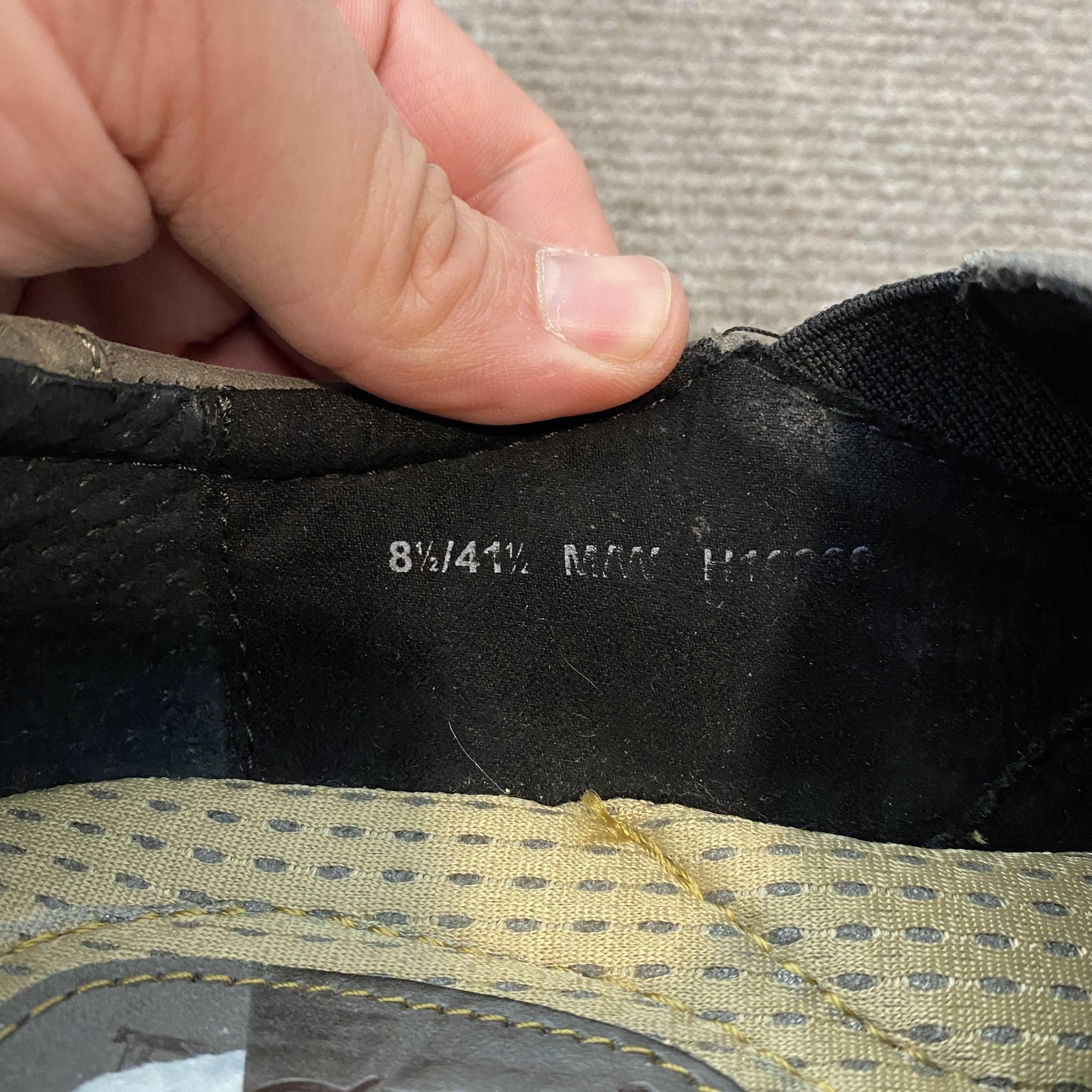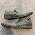 Previously worn shoes with noticeable creasing on uppers and some scuffing on leather panels and heels. Insoles show wear and adhesive residue on one heel pad. Outsoles have light dirt and wear but tread remains in good usable condition. Brand: Born (Børn) Style: Mens casual slip-on loafers with textile canvas uppers and leather trim. Color: Gray canvas with brown leather accents, yellow contrast stitching, and black elastic gores. Size: Mens US 8.5 / EU 41.5 (per interior size stamp). Details: Round toe, dual elastic goring for easy on and off, padded perforated insole for comfort, flexible black rubber outsole with Born branding, decorative cross-stitch detail at sides. These versatile slip-on shoes are designed for everyday comfort and casual wear.