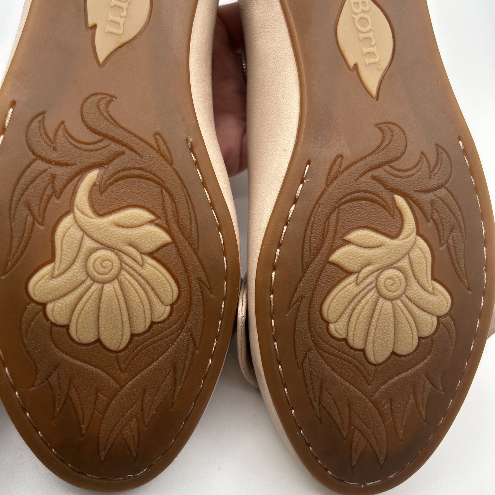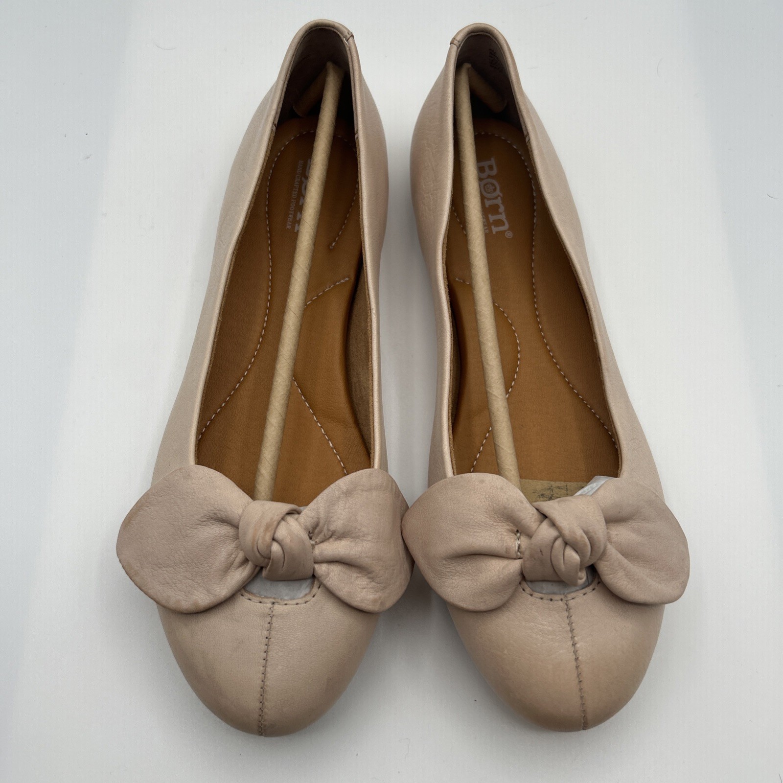 Born Women’s leather ballet flat w/bow, pink, size 8M, New-condition, but there are skiff marks on uppers and bows from being stored unboxed. Please review pictures carefully! (000A27)