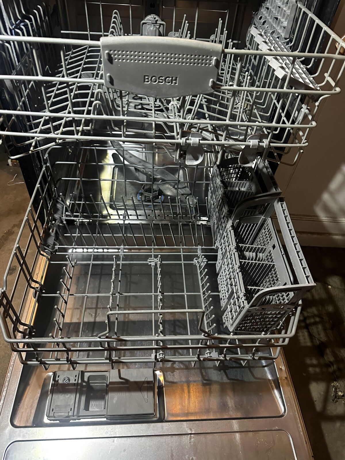Upgrade your kitchen with the Bosch-100 Series 24” Top Control Built In Dishwasher. This high-quality dishwasher is perfect for those who need a reliable and efficient dishwashing experience. With its stainless steel finish and tub material, this dishwasher is built to last. This integrated dishwasher is easy to use and requires only 120V power. Its sleek silver color adds a modern touch to any kitchen decor. The Bosch SHX57C05UC/31 model is designed to meet all your dishwashing needs with its top control feature. Install it today and enjoy a hassle-free dishwashing experience. •Height: 33 8/9 inches •Width: 23 1/2 inches •Depth: 22 3/5 inches •Number of racks: 3 •Energy star certified uses less than 3.3 gal. Per cycle •The tub( bottom) of the unit is polypropylene. The sides back and top are stainless. * Has a few imperfections in front of the body of the dishwasher on the left hand corner, scratches. Has a few stained areas inside the dishwasher located near the soap dispenser.