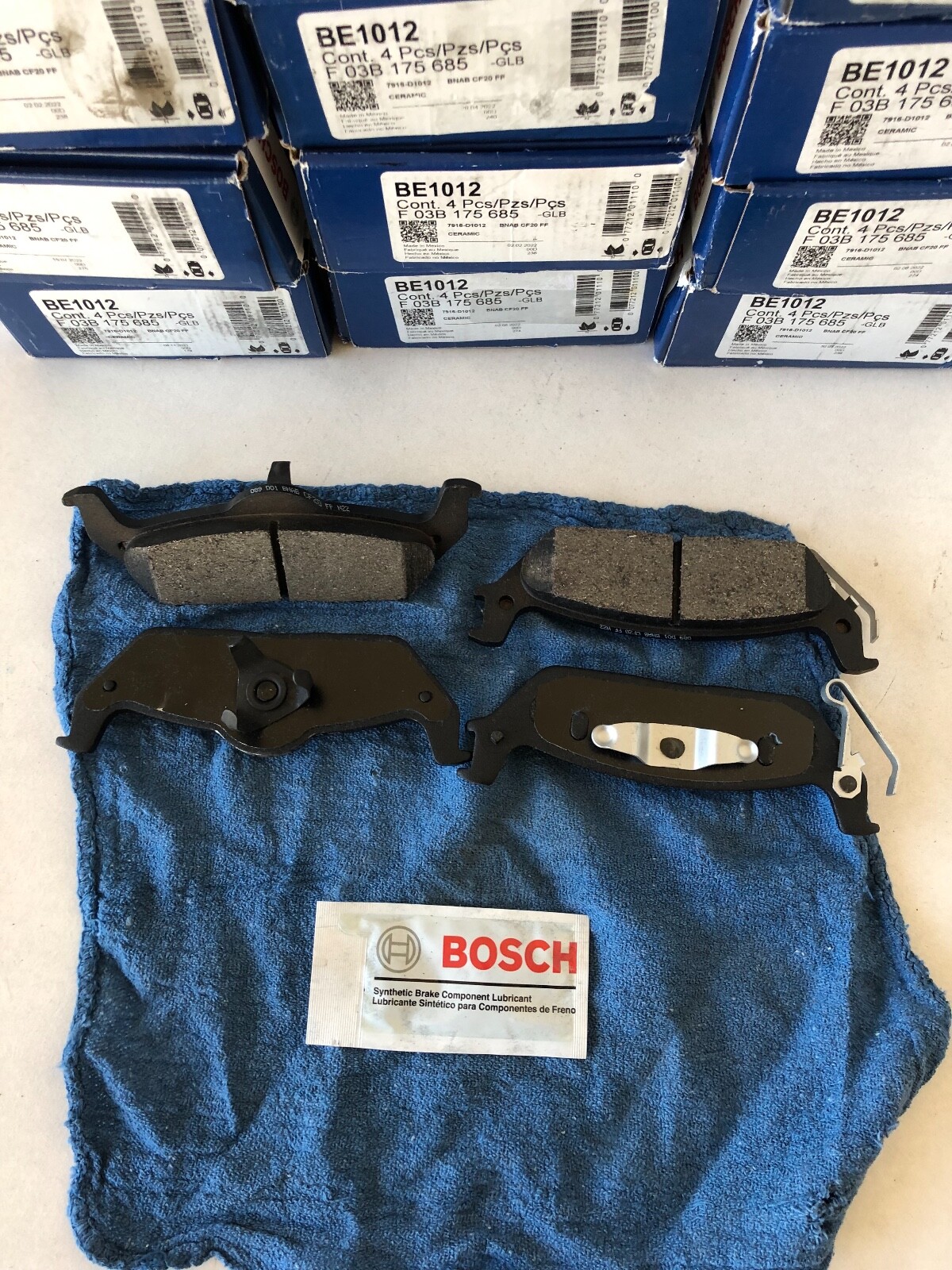 Bosch BE1012 Blue Disc Brake Pad Set Ceramic REAR for Select Ford F-150, Lincoln models. Upon purchase you will receive *ONE* of the pictured brake pad sets which includes 4 pads, 1 lubricant packet, and a blue towel (where applicable). Brake pads are brand new in box, box may have cosmetic issues such as rips, wear, tear, dents, cuts, or other cosmetic issues. Brake Pad sets will be sent based on best condition first, the last 6 sets sold will not come with a blue towel. Please verify fitment before purchase as returns are not permitted. Please verify fitment directly with Bosch's fitment site: https://www.boschautoparts .com/p/blue-disc-brake-pads-be1012- Fitment compatibility guide on this listing is for reference only, please input your vehicles details into Bosch's fitment guide for accurate fitment. Platform specific for improved braking performance. Pad Wear Sensors Included No Hardware Installation Kit Included No Pad FMSI Number D1012 Friction Material Composition Ceramic Reduces Rotor Wear Better Noise Quiet Durability Better Stopping Power Best Overall Performance Better Advanced, platform specific Ceramic friction material formulation for optimal performance Superior noise dampening provided by OE-style multi-layer shims Rust inhibitive coating prevents rust Slots and chamfers match OE design for quick and easy installation Set includes pads for 1 axle (2 wheels) and synthetic lubricant for reduced resistance on sliding contact points; pads come wrapped in a protective blue shop towel within the box ( where applicable) ; hardware not included Bosch Blue Disc Brake Pads were created for the everyday driver, and benefit from the same robust testing and engineering processes as our premium braking line. Bosch Blue offers advanced, platform specific friction formulations (NAO-Ceramic and Semi-Metallic) for optimal performance. Blue delivers superior noise dampening capabilities with OE-style multi-layer shims. Rust inhibitive coating prevents the formation of rust and corrosion which can lead to pad degradation and noisy braking. OE design slots and chamfers deliver superior braking performance and efficient, quiet stops. Precision manufactured to strict tolerances for guaranteed fit, and simple, hassle-free installation. Supplied with synthetic lubricant for reduced resistance on sliding contact points. Set includes brake pads for 1 axle (2 wheels). NOTE: Pads come wrapped in a protective blue shop towel within the box (where applicable). Hardware not included. Advanced platform specific friction material formulations (NAO-Ceramic and semi-metallic formulas) for optimal performance Superior noise dampening provided by multi-layer shims Rust inhibitive coating prevents rust Synthetic lubricant included in all applications this helps reduce resistance on sliding contact points Slots and chamfers match OE design for quick and easy installation