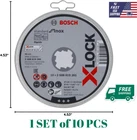 Product Description: The Bosch Professional 2608619267 10-Pack Straight Cutting Discs are designed for precise and efficient metal cutting, especially for tough materials like stainless steel (INOX). With 1 mm thickness , they offer clean and accurate cuts, making them ideal for professional use. Pack Includes : 10 Bosch Professional cutting discs, each with a 5-inch diameter (125 mm) and 0.87-inch bore (22.23 mm). X-Lock Compatible : These discs are optimized for Bosch X-Lock grinders for fast, tool-free disc changes but are compatible with standard grinders too. High Durability : Built for longevity and reduced warping with a 0.04-inch thickness for steady cuts. Key Benefits : Made for precise cuts across various metals. Reduced heat buildup when cutting stainless steel. Free Shipping : Enjoy quick, free shipping across the USA. Enhance your metalworking projects with these Bosch Professional cutting discs for reliability and precision in every cut.