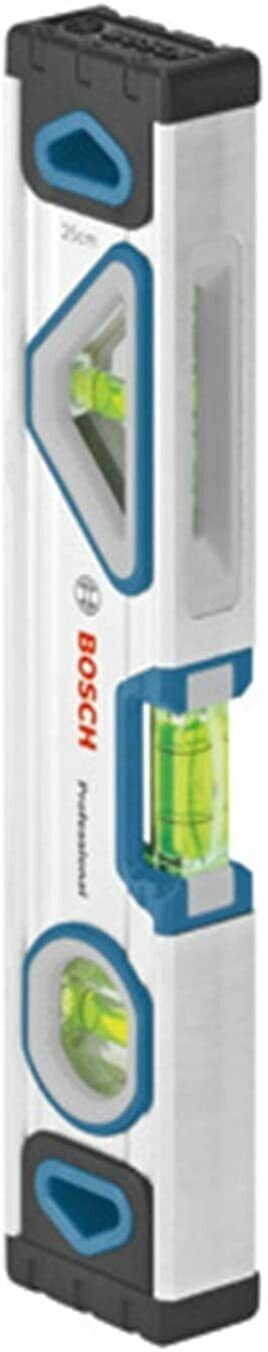 Bosch Professional 1600A016BN Spirit Level with Magnet System (Length: 25 cm, in Blister Packaging) Versatile and compact spirit level that can be stored conveniently in any tool bag Exceptionally easy to read in any working position thanks to the unique viewing window on the front Practical fastening option on metal surfaces thanks to three ferrite magnets embedded in the front side Suitable durability thanks to its solid aluminium housing, cast-in level with UV-resistant fluid and shock-absorbing end caps Items included: 1 x magnetic spirit level L x W x H - 254 x 27 x 50 mm, in blister packaging Product Description This compact, versatile spirit level from Bosch Professional is an indispensable element of every toolbox. A distinct viewing window with mirror technology on the front enables users to read vertical measurements from the front – ideal for narrow, difficult-to-access areas. The three embedded ferrite magnets mean that the spirit level has an strong hold on metallic construction elements. The rigid aluminium profile with reinforcing ribs ensures a long lifetime. Shock-absorbing end caps enhance its durability. The levels are embedded in the housing securely and filled with UV-resistant fluid. This guarantees maximum precision over years of use on construction sites.
