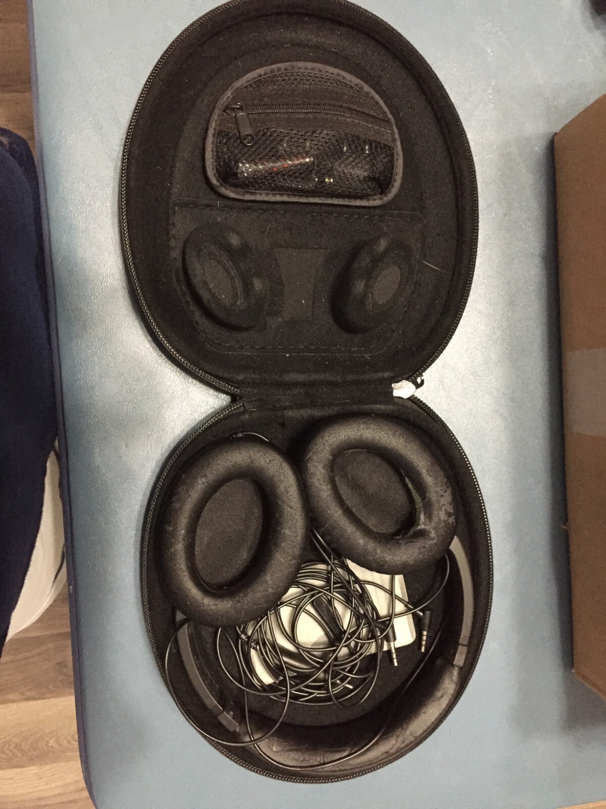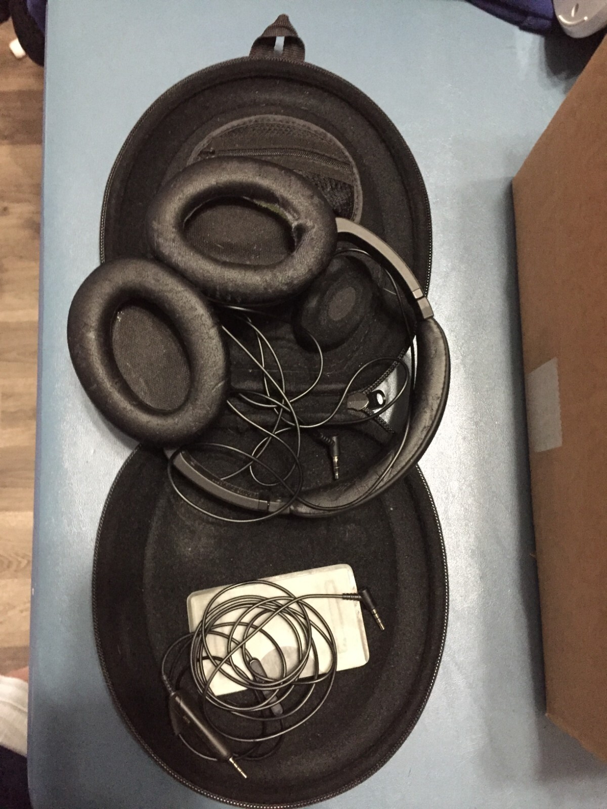 Experience the ultimate in sound quality with these Bose QuietComfort 15 headphones. Designed with a noise cancellation feature, you can immerse yourself in your music without any external disturbance. The headphones have a sleek black and gray design that is perfect for any occasion. The ear-cup (over the ear) form factor provides maximum comfort, while the double earpieces ensure a stereo sound quality. These headphones are made in China and come in a unit quantity of 'Good'. The right ear cushion has damage, but the product is still functional. The material has came apart and both ear cups has peeling on them. You can see the damage in the pictures.
